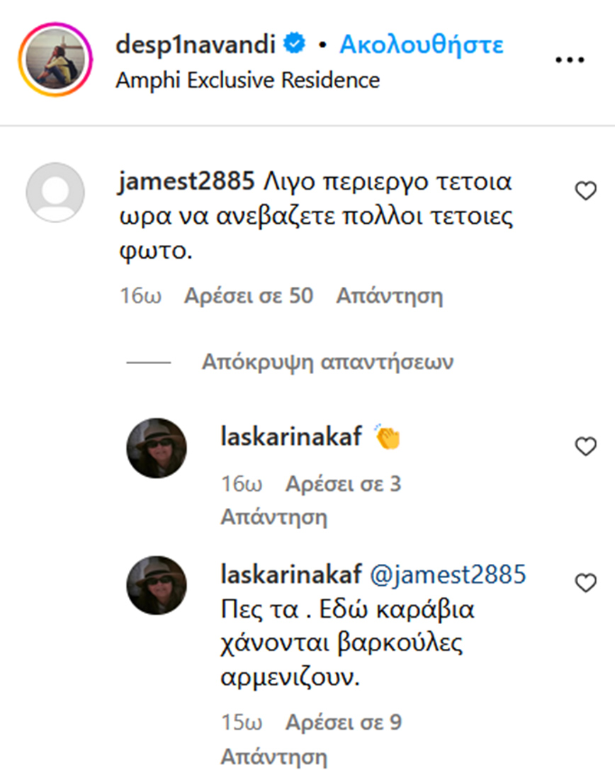 «Λίγο περίεργο τέτοια ώρα να ανεβάζετε πολλοί τέτοιες φωτογραφίες», έσπευσε να σχολιάσεις ένας χρήστης, με πολλούς να συνεχίζουν να εκφέρουν την άποψή τους, κάτω από τη δημοσίευση της Δέσποινας Βανδή. «Πες τα. Εδώ καράβια χάνονται, βαρκούλες αρμενίζουν», απάντησε κάτω από αυτό το σχόλιο ένας άλλος.