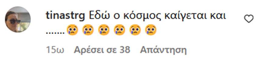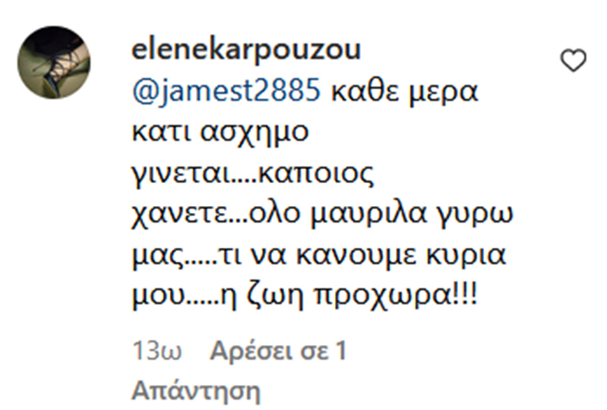 «Εδώ ο κόσμος καίγεται και…» ανέφερε ένας άλλος. Μεταξύ άλλων, όμως, άλλοι χρήστες υπερασπίστηκαν το ζευγάρι, γράφοντας θετικά σχόλια για αυτούς. «Κάθε μέρα κάτι άσχημο γίνεται…. Κάποιος χάνεται… Όλο μαυρίλα γύρω μας….. Τι να κάνουμε κυρία μου….. Η ζωή προχωρά», ανέφερε κάποιος.