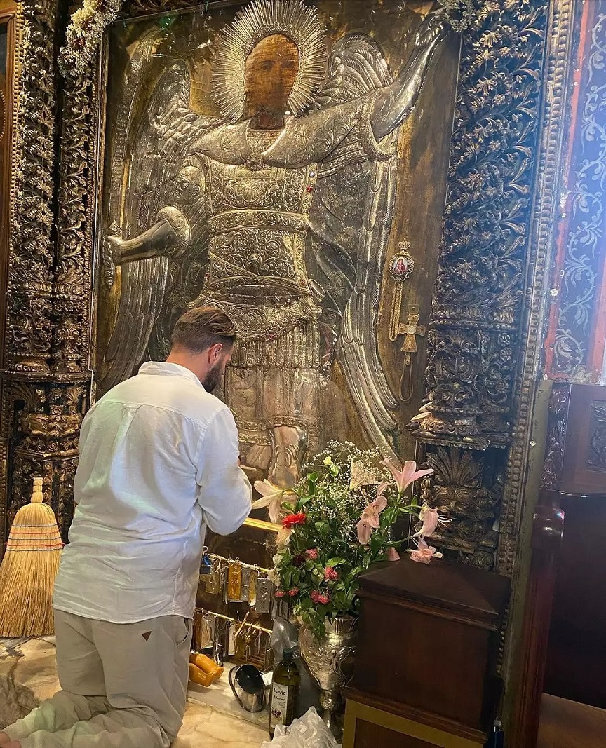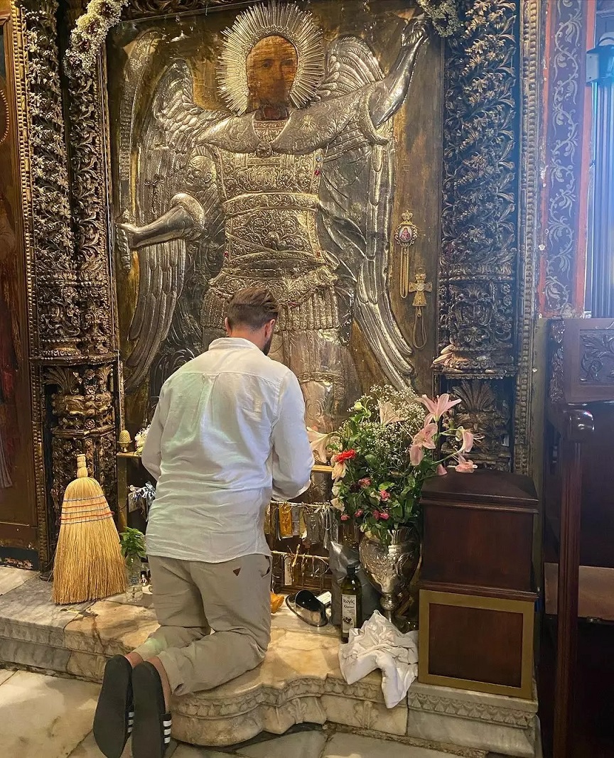 Στις φωτογραφίες που δημοσίευσε, ο Ηλίας Βρεττός προσεύχεται γονατιστός μπροστά στην εικόνα του Αρχάγγελου Μιχαήλ.