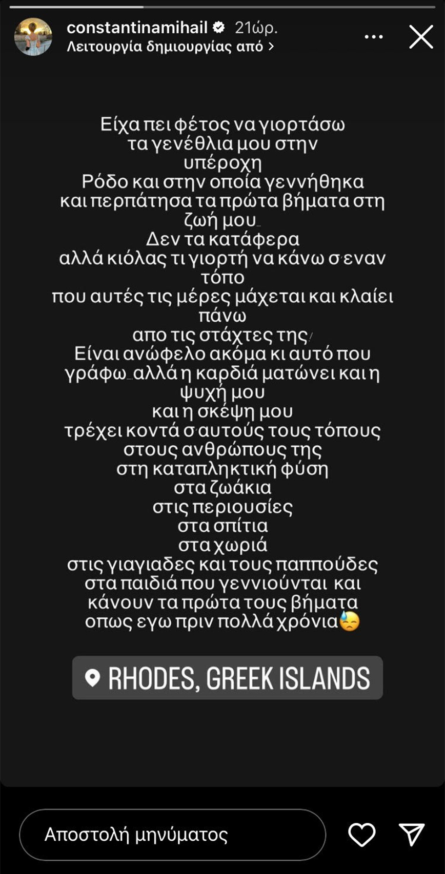 «Είχα πει να γιορτάσω φέτος τα γενέθλιά μου στην υπέροχη Ρόδο στην οποία γεννήθηκα και περπάτησα τα πρώτα βήματα της ζωής μου. Δεν τα κατάφερα και τι γιορτή να κάνω σε έναν τόπο που μάχεται και κλαίει πάνω από τις στάχτες του.