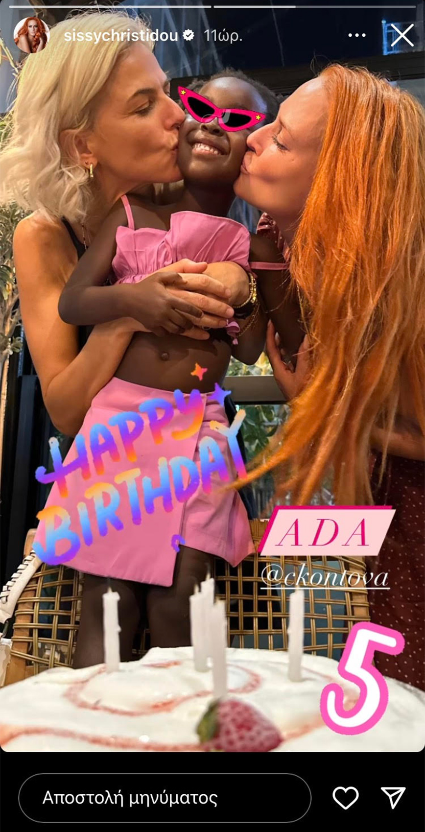 Η μικρή Ada είναι στη μέση της φωτογραφίας και χαμογελάει ενώ η νονά της Σίσσυ Χρηστίδου και η μητέρα της Χριστίνα Κοντοβά την φιλούν.