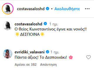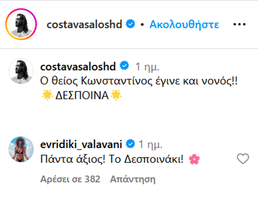 Ένα σχόλιο κάτω από ανάρτηση του Κωνσταντίνου Βασάλου έκανε η μέχρι πρότινος σύντροφός του Ευρυδίκη Βαλαβάνη. Με αυτή της την κίνηση επιβεβαίωσε πως οι δύο τους έχουν μετά τον χωρισμό τους μία άψογη σχέση.