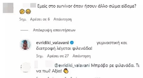 «Εμείς, στο Survivor όταν ήσουν, άλλο σώμα είδαμε;» έγραψε μια ακόλουθός της στο Instagram με την ίδια να απαντά, «Γυμναστική και διατροφή λέγεται φιλενάδα».