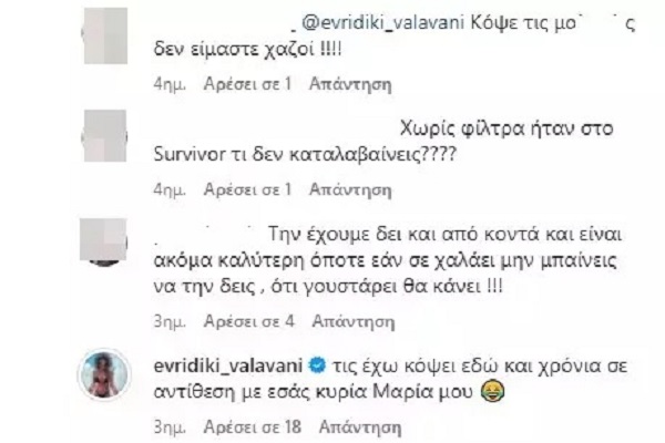 «Κόψε τις μαλ…ιες, δεν είμαστε χαζοί». «Χωρίς φίλτρα ήταν στο Survivor τι δεν καταλαβαίνεις;» απάντησαν άλλες άλλες followers της Ευρυδίκης Βαλαβάνη με την ίδια να αποκρίνεται εκ νέου γράφοντας, «Τις έχω κόψει εδώ και χρόνια σε αντίθεση με εσάς κυρία Μαρία μου».
