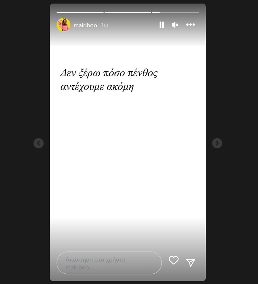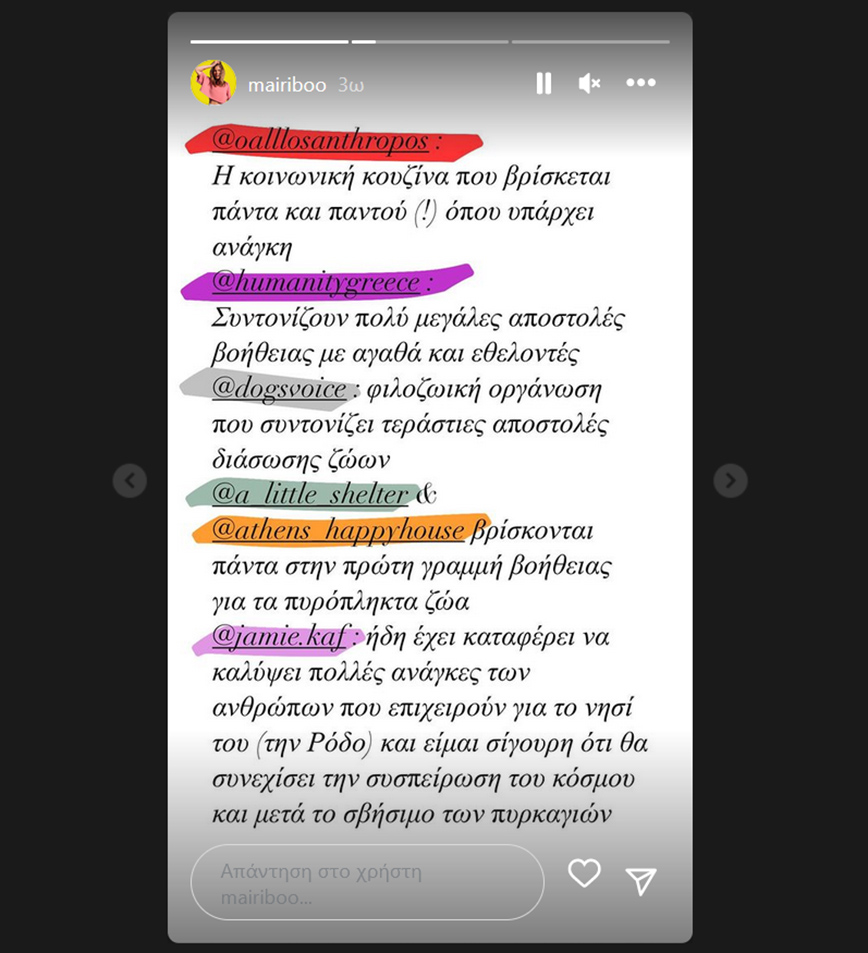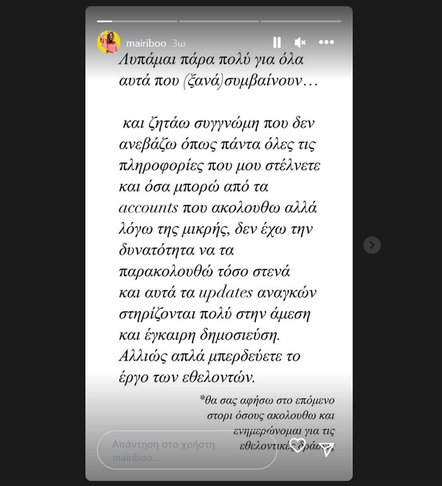 «Λυπάμαι πάρα πολύ για όλα αυτά που “ξανά” συμβαίνουν… και ζητάω συγγνώμη που δεν ανεβάζω, όπως πάντα, όλες τις πληροφορίες που μου στέλνετε και όσα μπορώ από τα accounts που ακολουθώ, αλλά λόγω της μικρής, δεν έχω την δυνατότητα να παρακολουθώ τόσο στενά αυτά τα updates αναγκών στηρίζονται στηρίζονται πολύ στην άμεση και έγκαιρη δημοσίευση. Αλλιώς απλά μπερδεύετε το έργο των εθελοντών», έγραψε αρχικά σε story της η Μαίρη Συνατσάκη.