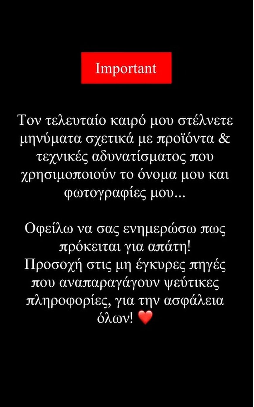 «Τον τελευταίο καιρό μου στέλνετε μηνύματα σχετικά με προϊόντα και τεχνικές αδυνατίσματος που χρησιμοποιούν το όνομά μου και φωτογραφίες μου. Οφείλω να σας ενημερώσω ότι πρόκειται για απάτη. Προσοχή στις μη έγκυρες πηγές που αναπαράγουν ψεύτικες πληροφορίες, για την ασφάλεια όλων!» έγραψε στην ανάρτησή της η τραγουδίστρια.