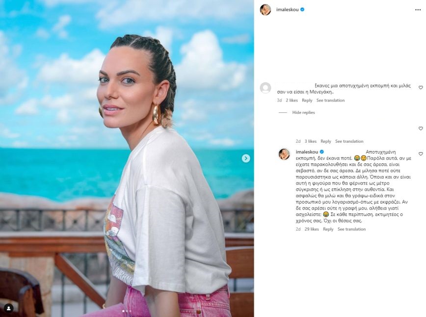Πιο συγκεκριμένα, το σχόλιο που δέχθηκε γράφει: «Έκανες μια αποτυχημένη εκπομπή και μιλάς σαν να είσαι η Μενεγάκη».