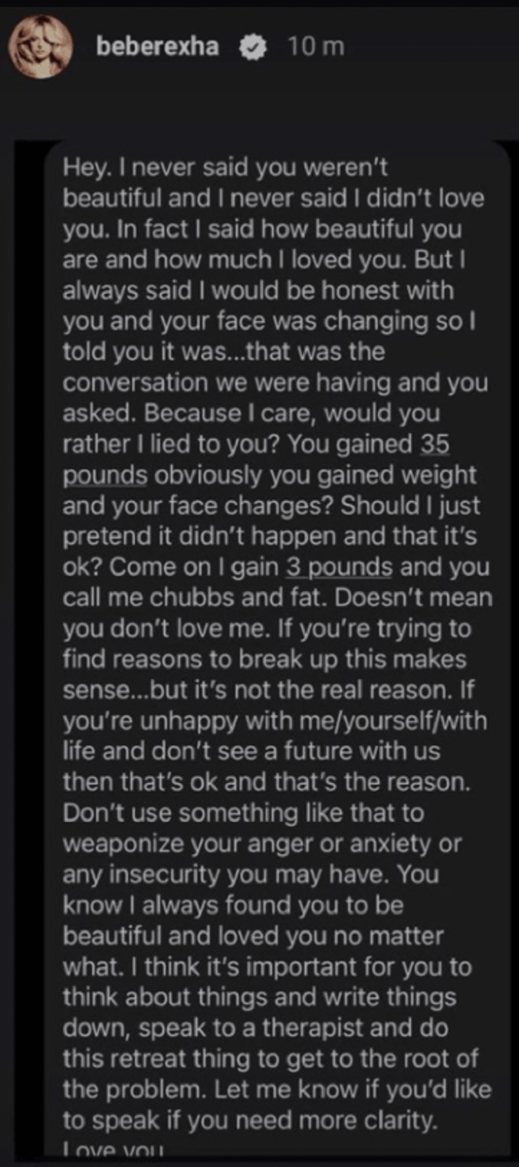 Η επιβεβαίωση του χωρισμού έρχεται μερικές ημέρες αφότου η Bebe Rexha ανάρτησε στα social media ένα μήνυμα φαινομενικά από τον 39χρονο κινηματογραφιστή και μέχρι πρότινος σύντροφό της, στο οποίο εμφανίζεται να της ασκεί κριτική επειδή «προσφάτως πήρε κιλά».