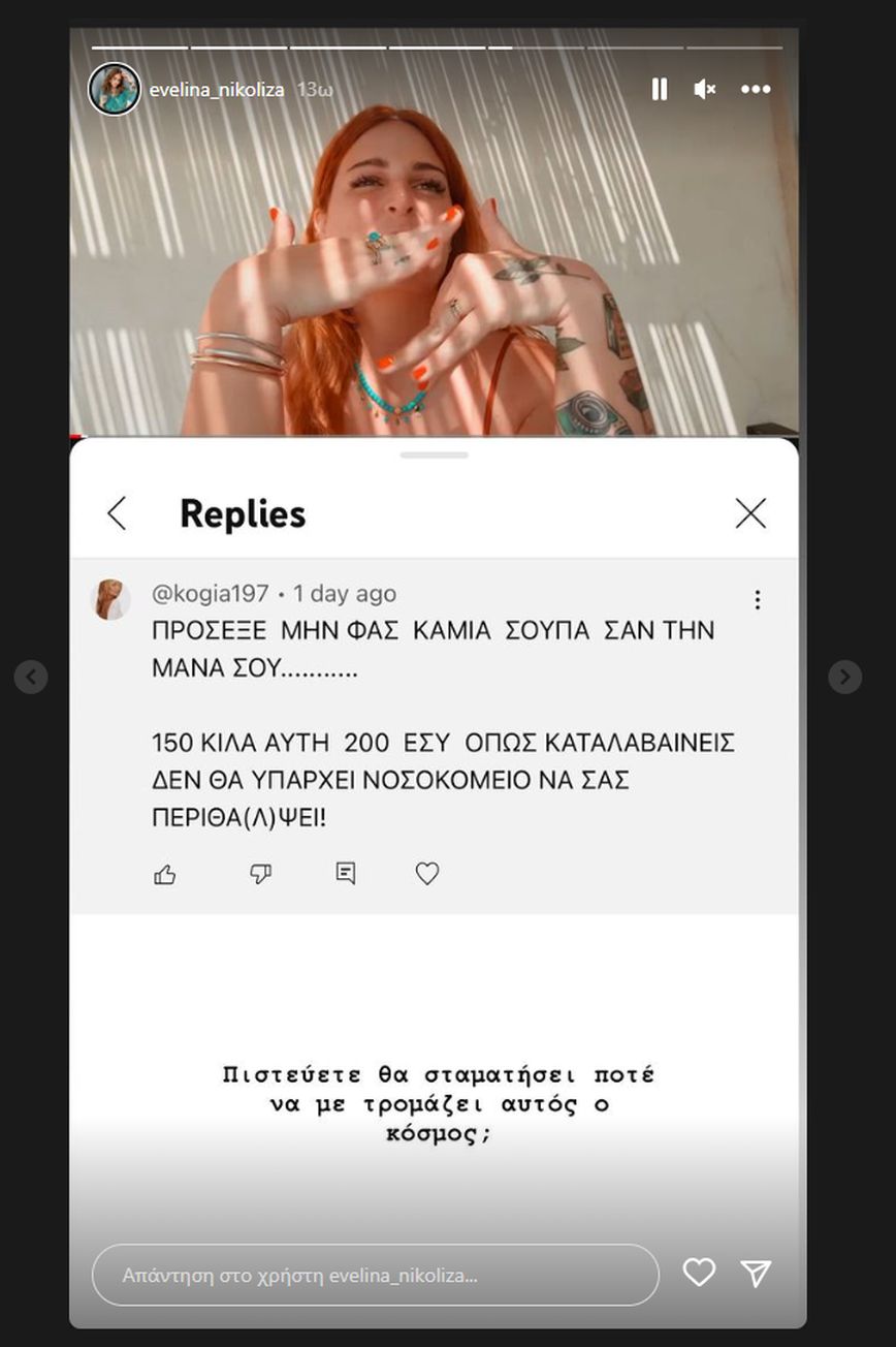 Το σχόλιο αυτό αναδημοσίευσε η Εβελίνα Νικόλιζα στον προσωπικό της λογαριασμό στο Instagram και αναρωτήθηκε: «Πιστεύετε θα σταματήσει ποτέ να με τρομάζει αυτός ο κόσμος;».