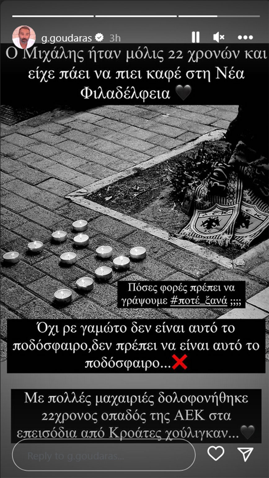 Τη στενοχώρια του σχετικά με τη δολοφονία του 29χρονου οπαδού της ΑΕΚ εξέφρασε σήμερα ο Γρηγόρης Γκουντάρας. Ο παρουσιαστής, όντας και ο ίδιος οπαδός της συγκεκριμένης ομάδας, δεν έκρυψε τον θυμό του και τη θλίψη του, σχετικά με τα όσα έγιναν χθες το βράδυ.