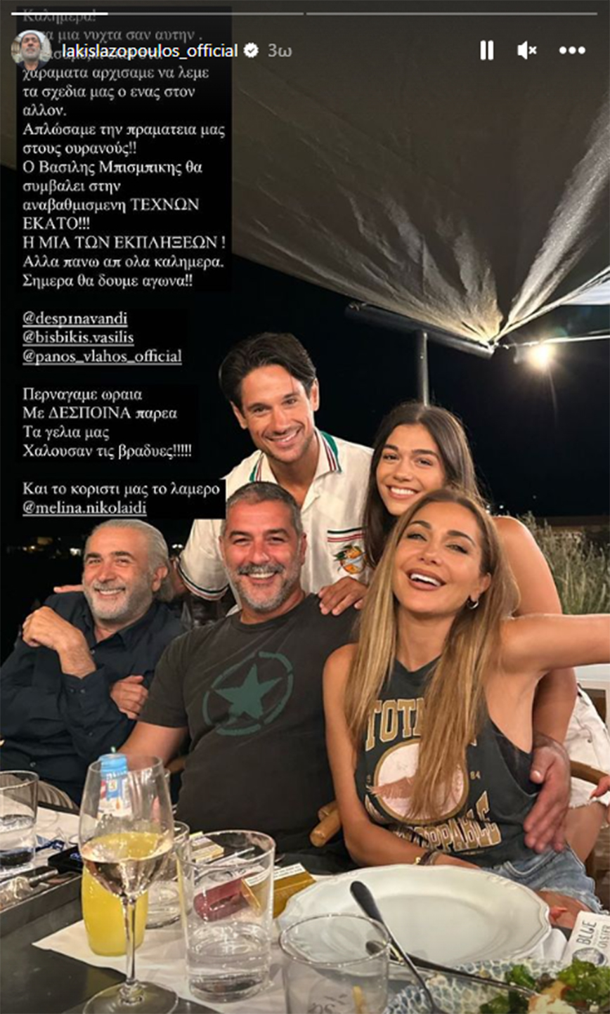 Μάλιστα, ο Λάκης Λαζόπουλος ανέβασε μια φωτογραφία στα stories του προσωπικού του λογαριασμού στο Instagram, δείχνοντας ένα στιγμιότυπο από τις όμορφες στιγμές που πέρασαν όλοι μαζί. Πάνω στην φωτογραφία, ο ίδιος έγραψε έναν καλό λόγο για όλους τους παρευρισκόμενους.