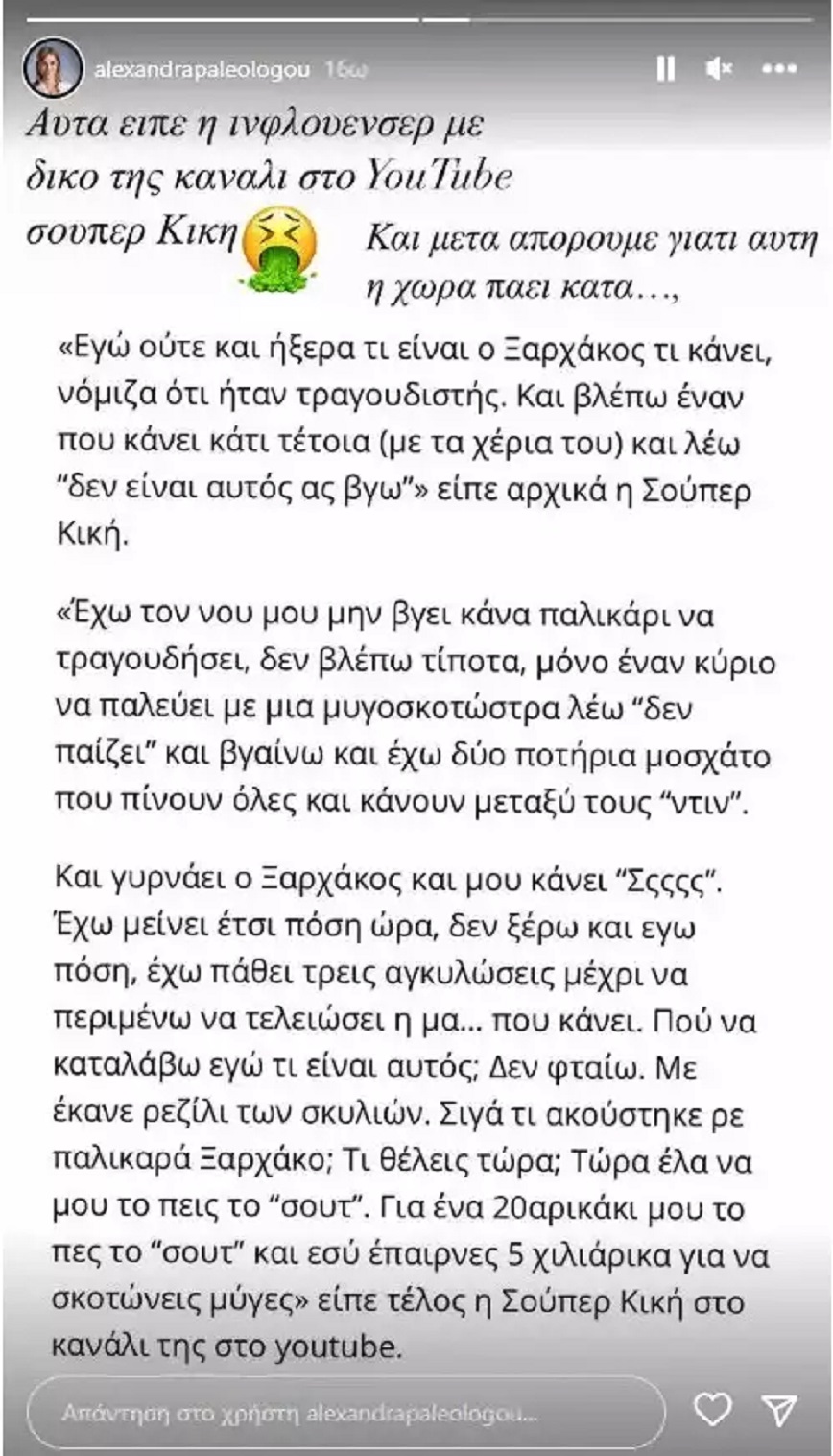 Η Αλεξάνδρα Παλαιολόγου προστέθηκε στα πρόσωπα από τον χώρο της showbiz που σχολίασε επικριτικά τις δηλώσεις που έκανε η Super Κική για ένα περιστατικό σε μαγαζί που εργαζόταν και είχε ως πρωταγωνιστή τον Σταύρο Ξαρχάκο.