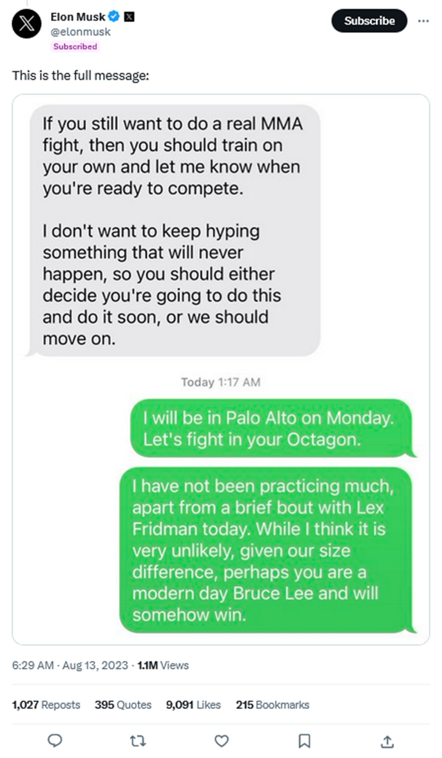 Με το μαύρο χιούμορ που τον χαρακτηρίζει, ο Μασκ απάντησε στον Ζούκερμπεργκ: «Θα είμαι στο Palo Alto τη Δευτέρα. Ας κάνουμε τη μάχη στο οκτάγωνό σου», ενώ πρόσθεσε πως «δεν έχω προπονηθεί ιδιαίτερα, εκτός από μια συνάντηση με τον Lex Fridman σήμερα. Αν και πιστεύω πως είναι αρκετά απίθανο, κρίνοντας από το μέγεθός σου, ίσως είσαι ένας σύγχρονος Bruce Lee και ίσως κερδίσεις».