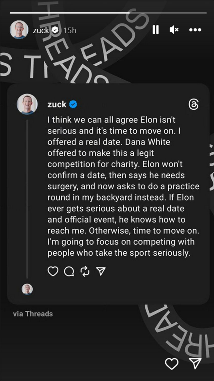 ‘Ομως, σύμφωνα με τα λεγόμενα του Μαρκ Ζούκερμπεργκ, ο Έλον Μασκ δεν σταμάτησε εκεί, καθώς, όπως αναφέρει, ο Έλον του ζήτησε να κάνουν μια πρόβα τον αγώνα τους. Συγκεκριμένα, συνέχισε στη δημοσίευσή του στο Threads, γράφοντας πως «τώρα, μου ζητά να κάνουμε μια προπόνηση στην αυλή μου. Αν ο Έλον σοβαρευτεί και προτείνει μια πραγματική ημερομηνία για το event, ξέρει που θα με βρει. Αλλιώς, είναι ώρα να προχωρήσουμε. Θα επικεντρωθώ στο να διαγωνίζομαι με ανθρώπους που παίρνουν το άθλημα στα σοβαρά».