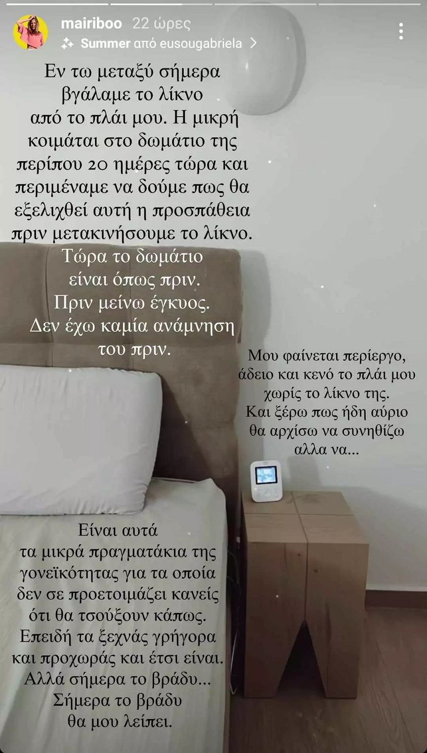 Μου φαίνεται περίεργο, άδειο και κενό το πλάι μου χωρίς το λίκνο της. Και ξέρω πως ήδη αύριο θα αρχίσω να συνηθίζω αλλά να… Είναι αυτά τα μικρά πραγματάκια της γονεϊκότητας για τα οποία δεν σε προετοιμάζει κανείς ότι θα τσούξουν κάπως. Επειδή τα ξεχνάς γρήγορα και προχωράς και έτσι είναι. Αλλά σήμερα το βράδυ… Σήμερα το βράδυ θα μου λείπει» εξομολογήθηκε χαρακτηριστικά η Μαίρη Συνατσάκη.