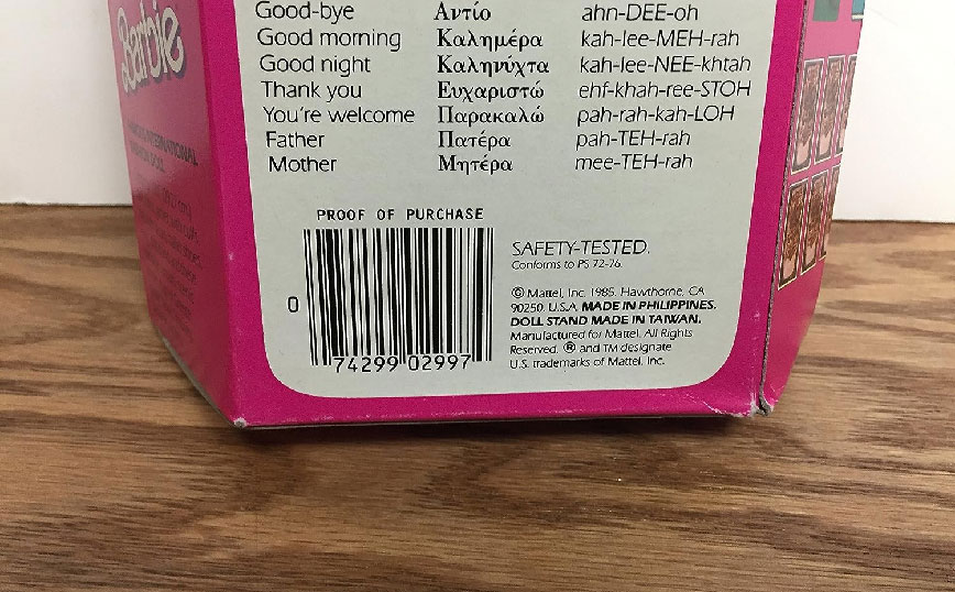 Η συσκευασία περιείχε περιγραφή της Ελλάδας στο οποίο αναφερόταν πως τότε οι περισσότεροι άνθρωποι ζούσαν σε χωριά. Ο δημιουργός της Barbie έγραφε για την Αρχαία Ελλάδα, την ελληνική σημαία αλλά και τα… πανηγύρια.