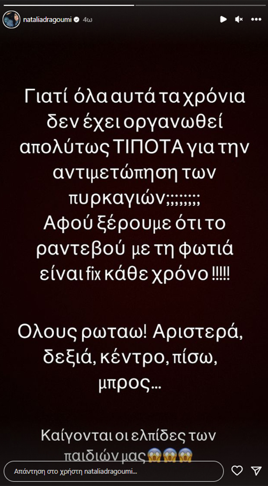 «Γιατί όλα αυτά τα χρόνια δεν έχει οργανωθεί απολύτως ΤΙΠΟΤΑ για την αντιμετώπιση των πυρκαγιών;;;; Αφού ξέρουμε ότι το ραντεβού με τη φωτιά είναι fix κάθε χρόνο… Όλους ρωτάω… Αριστερά, δεξιά, κέντρο, πίσω, μπρος…