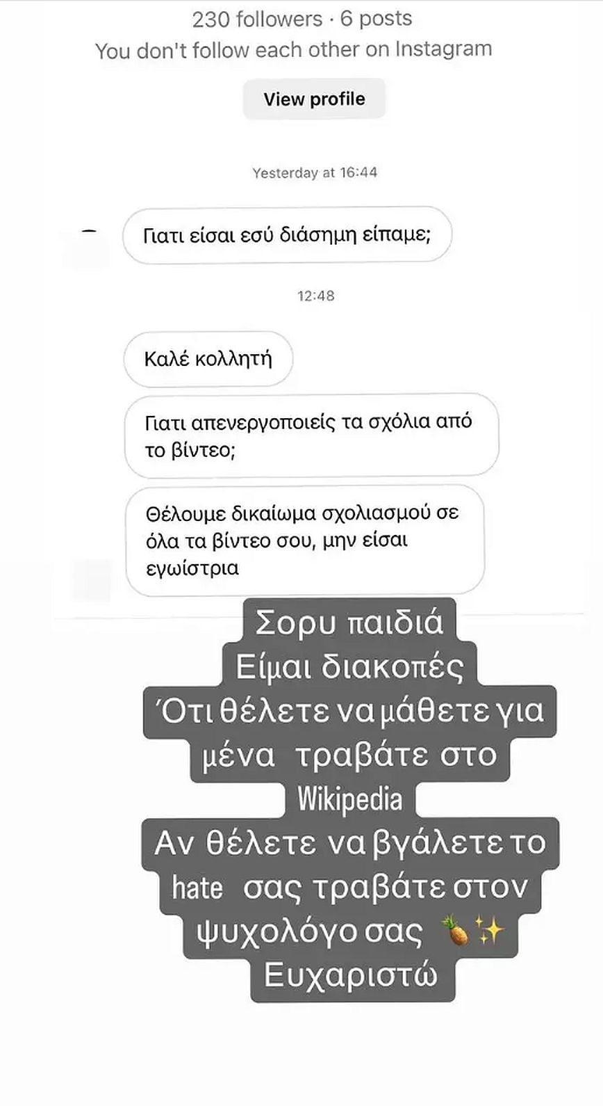 «Γιατί είσαι εσύ διάσημη είπαμε;» ήταν η πρώτη ερώτηση που έλαβε η ηθοποιός και στη συνέχεια της έγραψε ο ίδιος ακόλουθος: «Καλέ κολλητή, γιατί απενεργοποιείς τα σχόλια από το βίντεο; Θέλουμε δικαίωμα σχολιασμού σε όλα τα βίντεο σου. Μην είσαι εγωίστρια».