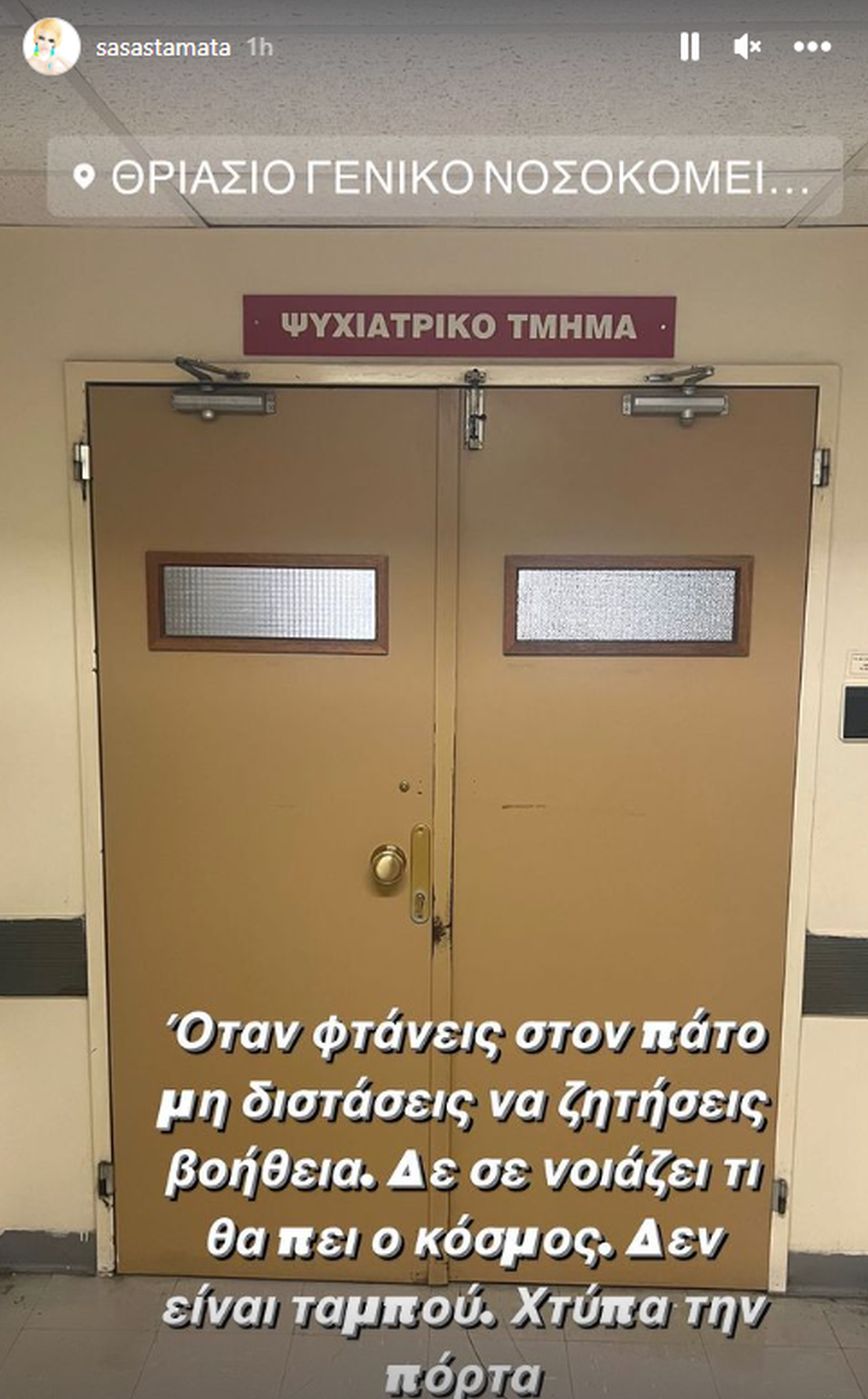 Μια φωτογραφία από το ψυχιατρικό τμήμα του Θριάσιου Γενικού Νοσοκομείου ανάρτησε σε story της στο Instagram η Σάσα Σταμάτη. Μάλιστα, η δημοσιογράφος έστειλε και ένα μήνυμα στους διαδικτυακούς της φίλους, λέγοντας μεταξύ άλλων: «Δεν σε νοιάζει τι θα πει ο κόσμος. Δεν είναι ταμπού. Χτύπα την πόρτα».