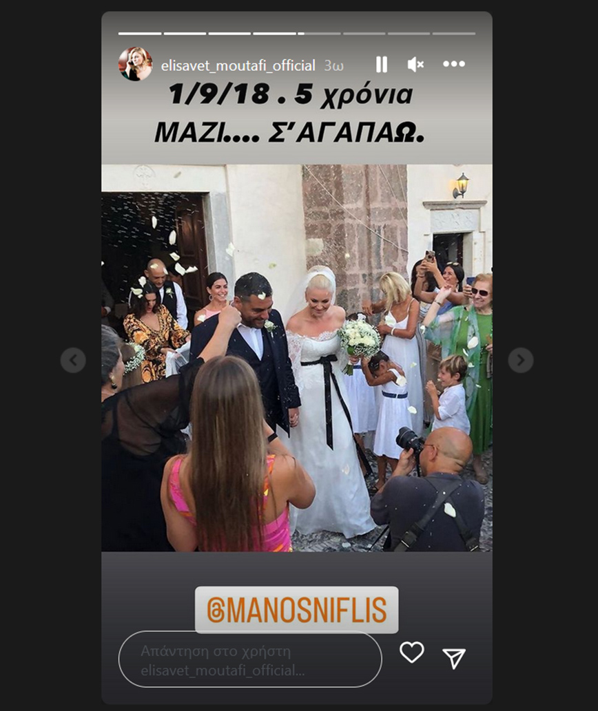 Αρχικά, η ηθοποιός Ελισάβετ Μουτάφη πόσταρε ένα story στο Instagram της. Σε αυτό, είναι η ίδια στον γάμο της με τον Μάνο Νιφλή, ενώ έγραψε: «5 χρόνια μαζί. Σ’αγαπώ».