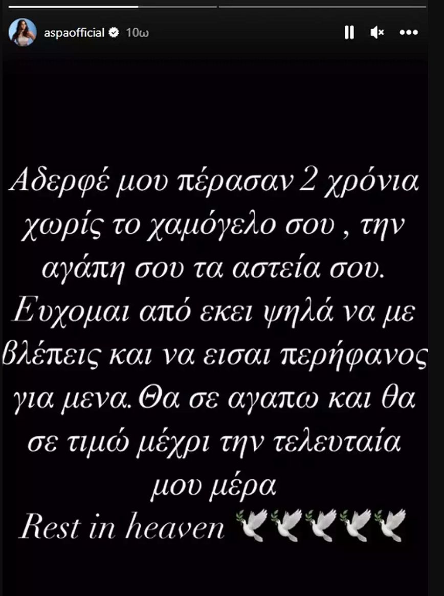 «Αδελφέ μου πέρασαν δύο χρόνια χωρίς το χαμόγελό σου, την αγάπη σου τα αστεία σου. Εύχομαι από εκεί ψηλά να με βλέπεις και να είσαι περήφανος για εμένα. Θα σε αγαπώ και θα σε τιμώ μέχρι την τελευταία μου μέρα. Αναπαύσου εν ειρήνη», έγραψε η Άσπα για τον αδελφό της, Mad Clip.