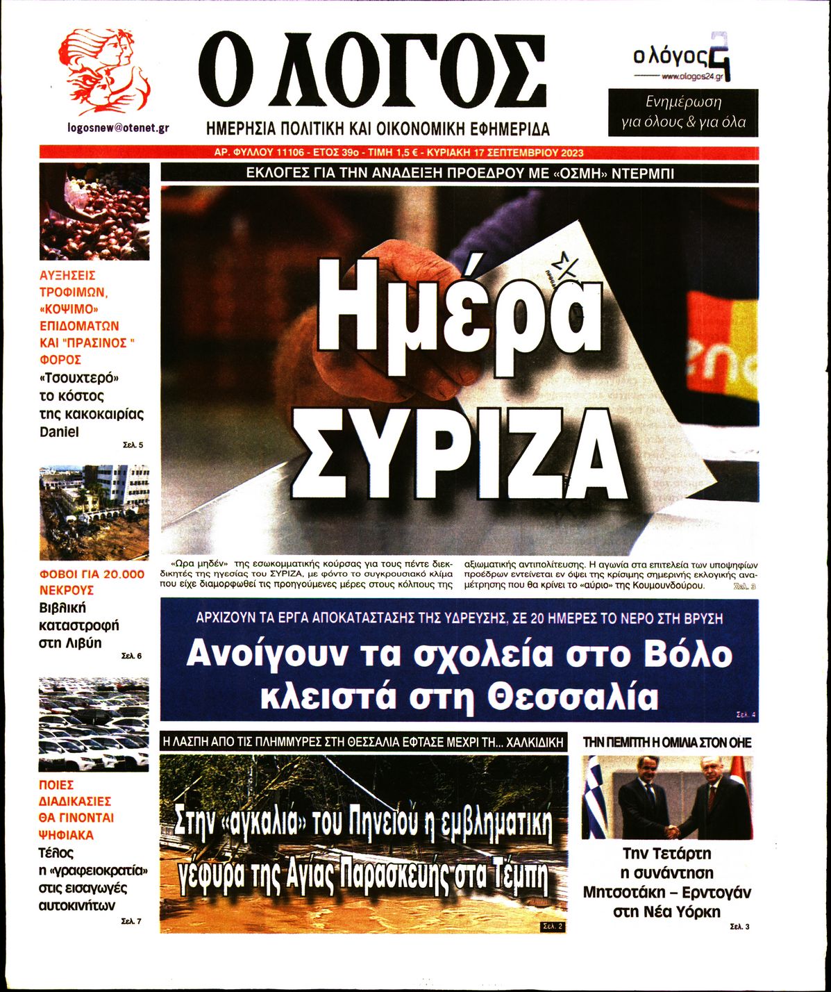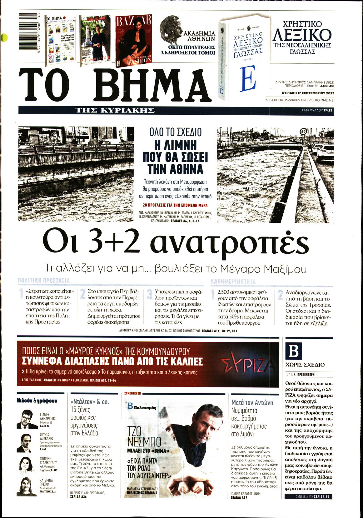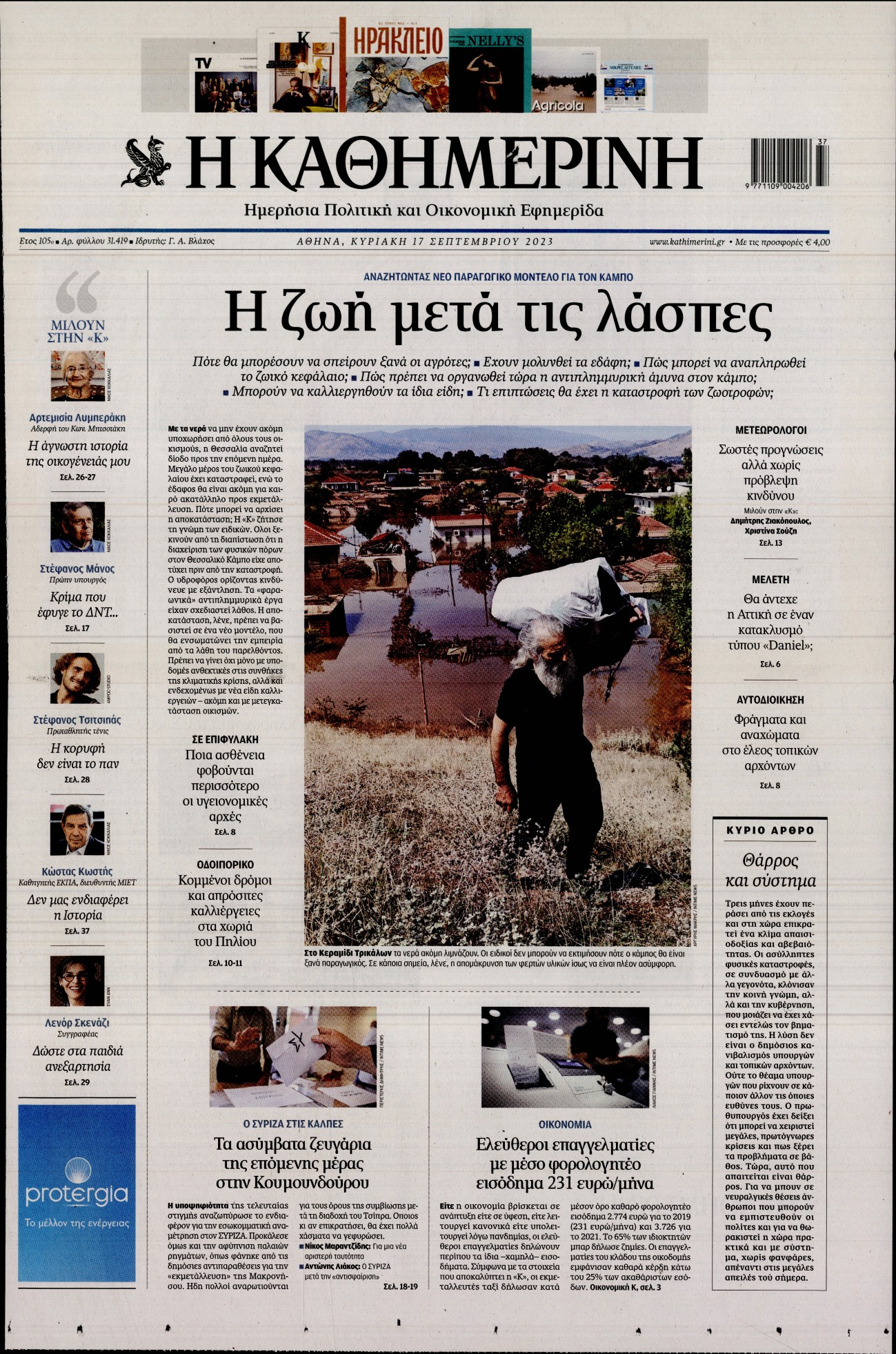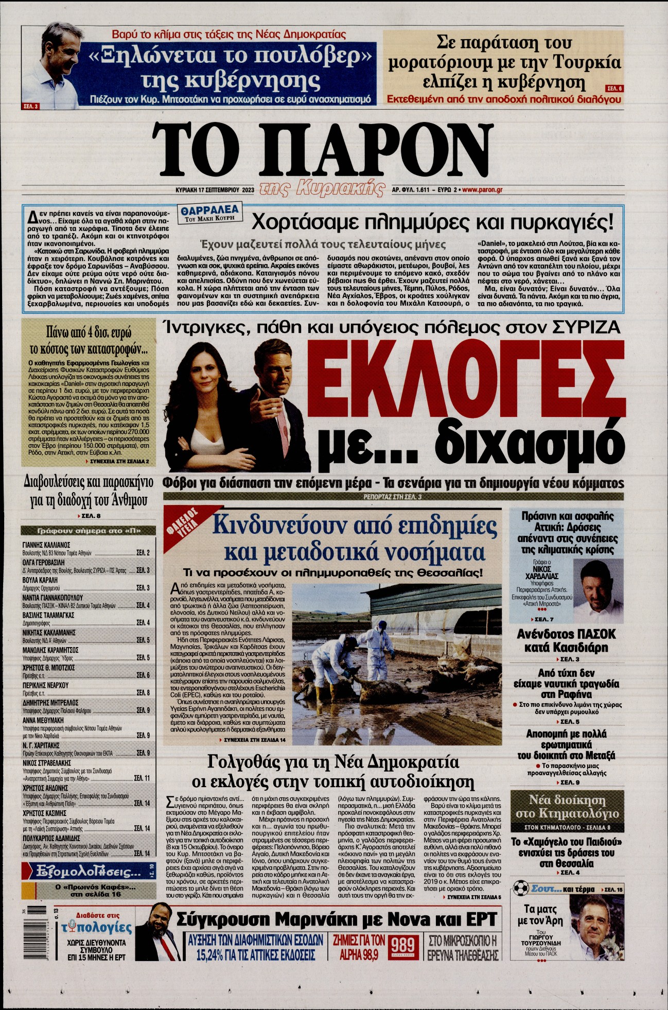 Το καταστροφικό πέρασμα της κακοκαιρίας Daniel από τη Θεσσαλία, η παρουσία του Κυριάκου Μητσοτάκη στη ΔΕΘ και οι εκλογές για την ανάδειξη νέου προέδρου στον ΣΥΡΙΖΑ ξεχωρίζουν στα πρωτοσέλιδα των κυριακάτικων εφημερίδων.
