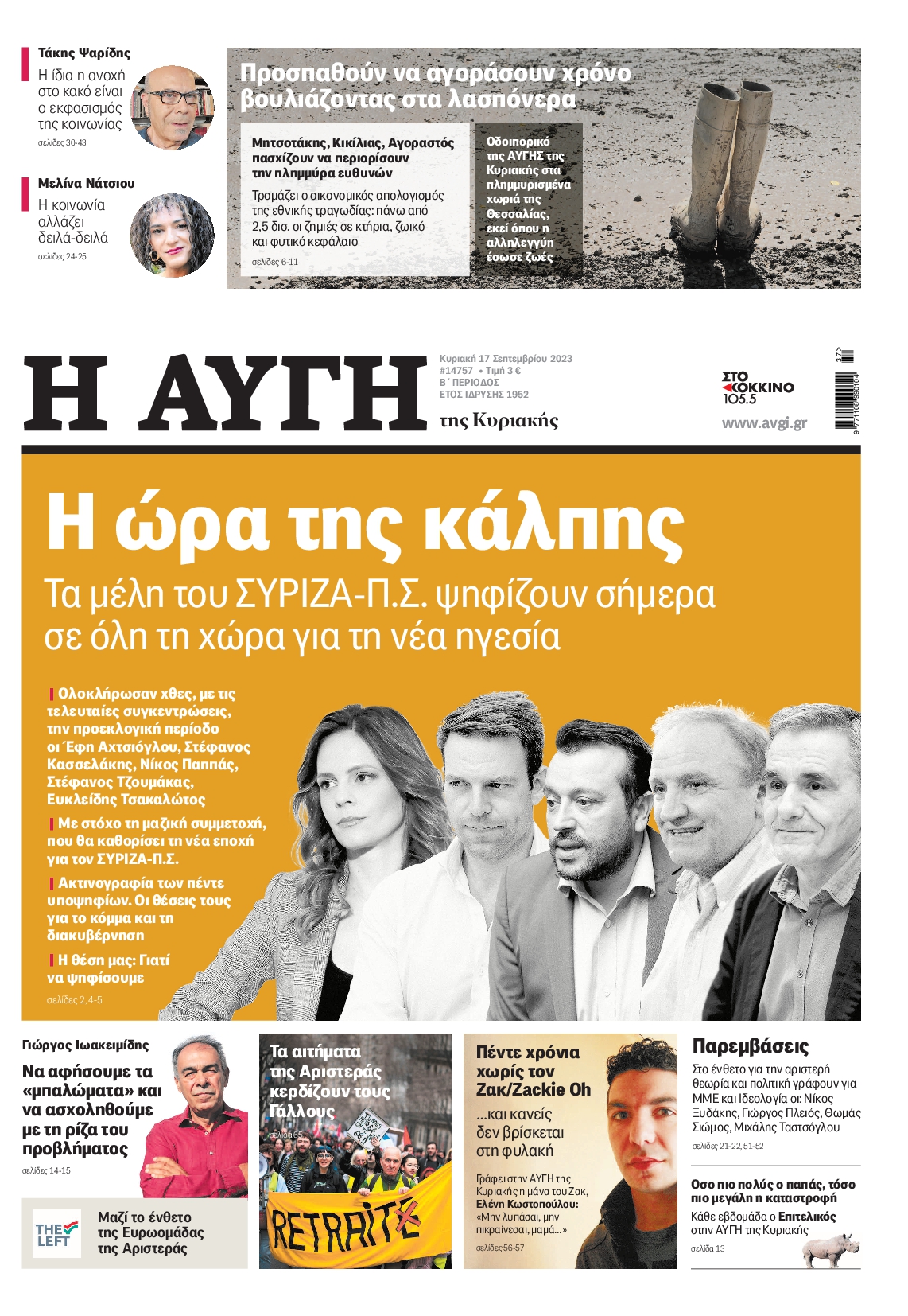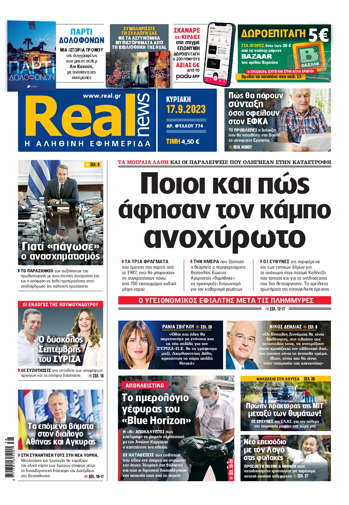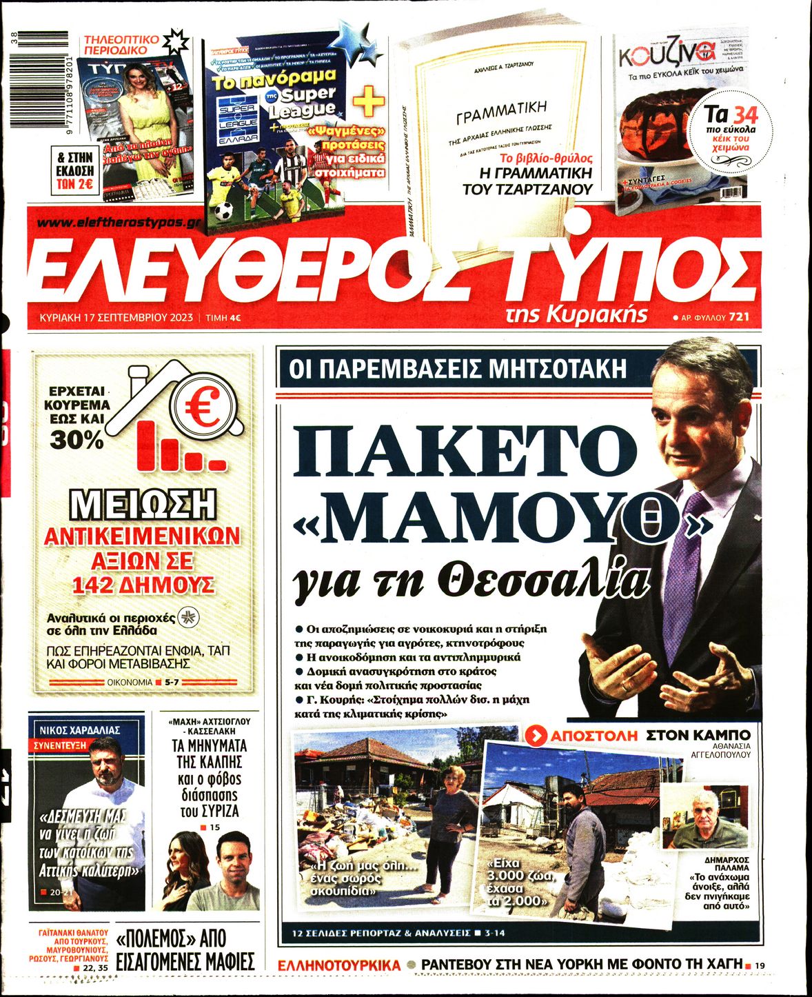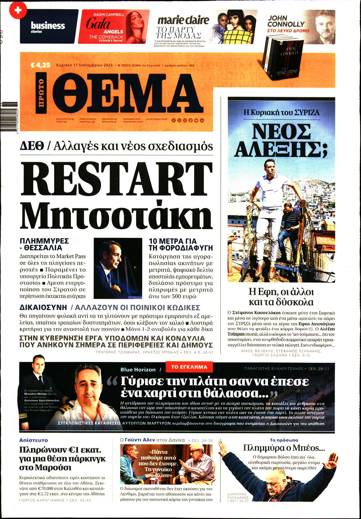 Το καταστροφικό πέρασμα της κακοκαιρίας Daniel από τη Θεσσαλία, η παρουσία του Κυριάκου Μητσοτάκη στη ΔΕΘ και οι εκλογές για την ανάδειξη νέου προέδρου στον ΣΥΡΙΖΑ ξεχωρίζουν στα πρωτοσέλιδα των κυριακάτικων εφημερίδων.