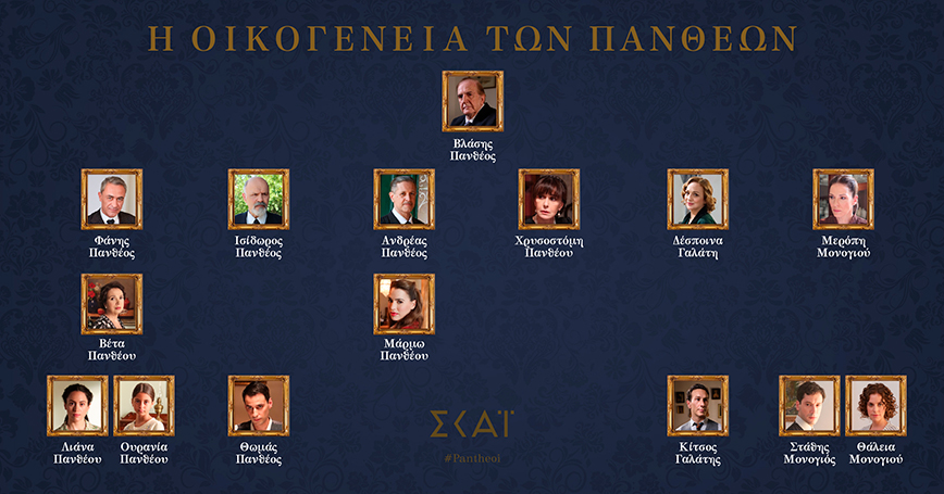 Οι Πανθέοι, η νέα δραματική σειρά του ΣΚΑΪ θα κάνει πρεμιέρα απόψε στις 21:00 και το αρχοντικό της ισχυρής οικογένειας θα ανοίξει για πρώτη φορά την πόρτα του ώστε να υποδεχθεί τους τηλεθεατές. Το αριστούργημα του βραβευμένου και ακαδημαϊκού Τάσου Αθανασιάδη μεταφέρεται στην τηλεοπτική οθόνη υπό τις σκηνοθετικές οδηγίες του Σπύρου Μιχαλόπουλου, σε σενάριο της Γιάννας Κανελλοπούλου και του Άγγελου Χασάπογλου και σε μία σύγχρονη παραγωγή υψηλών προδιαγραφών της εταιρείας JK PRODUCTIONS – ΚΑΡΑΓΙΑΝΝΗΣ.