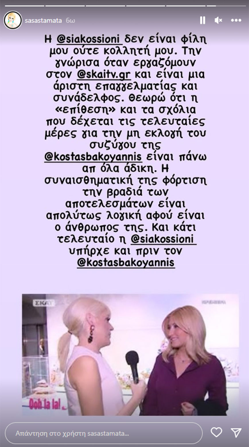 Μέσω μιας ανάρτησης στον προσωπικό της λογαριασμό στο Instagram η Σάσα Σταμάτη έγραψε: «Η Σία Κοσιώνη δεν είναι φίλη μου, ούτε κολλητή μου. Την γνώρισα όταν εργαζόμουν στον ΣΚΑΪ και είναι μία άριστη επαγγελματίας και συνάδελφος. Θεωρώ ότι η “επίθεση” και τα σχόλια που δέχεται τις τελευταίες μέρες για τη μη εκλογή του συζύγου της Κώστα Μπακογιάννη είναι πάνω απ’ όλα άδικη. Η συναισθηματική της φόρτιση τη βραδιά των αποτελεσμάτων είναι απολύτως λογική αφού είναι ο άνθρωπός της. Και κάτι τελευταίο, η Σία Κοσιώνη υπήρχε και πριν τον Κώστα Μπακογιάννη».