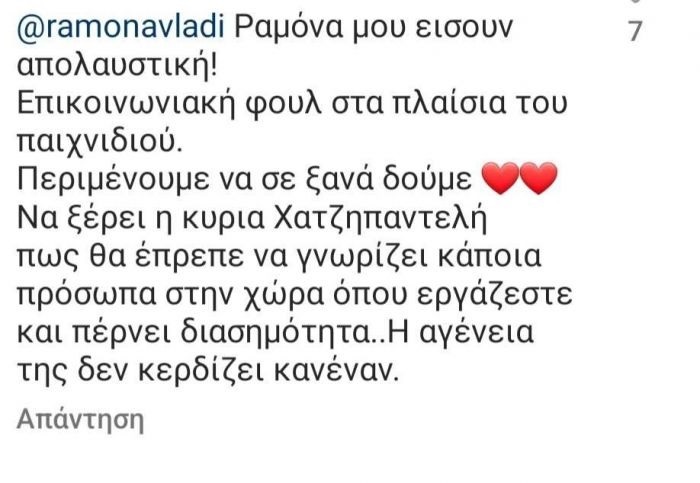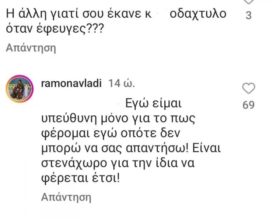Οι fans της Ραμόνας Βλαντή, αναρωτήθηκαν όπως και όλοι όσοι είδαν το επεισόδιο για ποιον λόγο έγινε αυτή η χειρονομία εναντίον της κι εκείνη θέλησε να δώσει την απάντησή της. Όπως είπε: «Εγώ είμαι υπεύθυνη μόνο για το πώς φέρομαι εγώ οπότε δεν μπορώ να σας απαντήσω! Είναι στενάχωρο για την ίδια να φέρεται έτσι!».