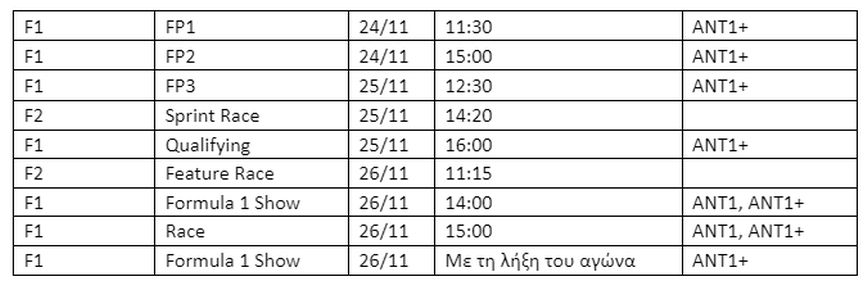 Στην εκπομπή «Formula 1 Show», που ξεκινά στις 14:00, μια ώρα πριν την απευθείας μετάδοση του αγώνα από τον ΑΝΤ1 και το ΑΝΤ1+, μπορείτε να παρακολουθήσετε μεταξύ άλλων μια αποκλειστική συνέντευξη του 67χρονου αγωνιστικού διευθυντή της Alpha Tauri, Φρανκ Τοστ, που αποχωρεί από την ενεργό δράση μετά από 23 χρόνια στη Formula 1. Η απεσταλμένη του ΑΝΤ1 στα Ηνωμένα Αραβικά Εμιράτα, Μαρία Θωμά, θα μας μεταφέρει τον παλμό του τελευταίου αγώνα της χρονιάς. Στην παρουσίαση της εκπομπής «Formula 1 Show» θα είναι ο Τάκη Πουρναράκης και ο Πάνος Σεϊτανίδης και στις μεταδόσεις θα βρίσκονται οι Μαρία Ανδρεάδη, Κώστας Λεώνης, Τάκης Πουρναράκης και Πάνος Σεϊτανίδης.