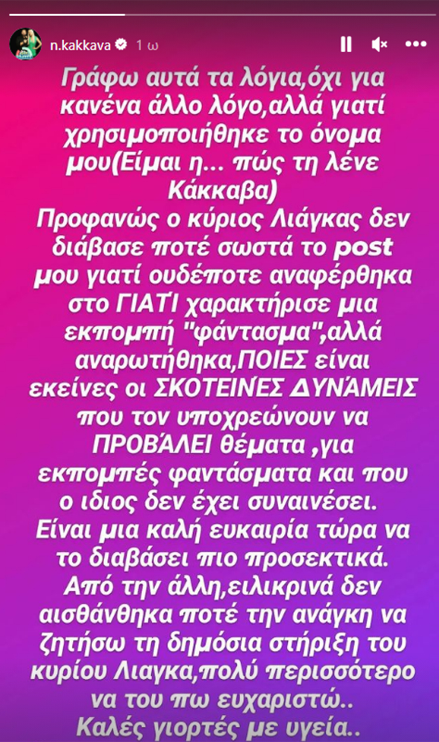 Είναι μια καλή ευκαιρία να το διαβάσει τώρα πιο προσεκτικά. Από την άλλη, ειλικρινά δεν αισθάνθηκα ποτέ την ανάγκη να ζητήσω τη δημόσια στήριξη του Γιώργου Λιάγκα, πολύ περισσότερο να του πω ευχαριστώ. Καλές γιορτές με υγεία» απάντησε η Ναταλί Κάκκαβα.