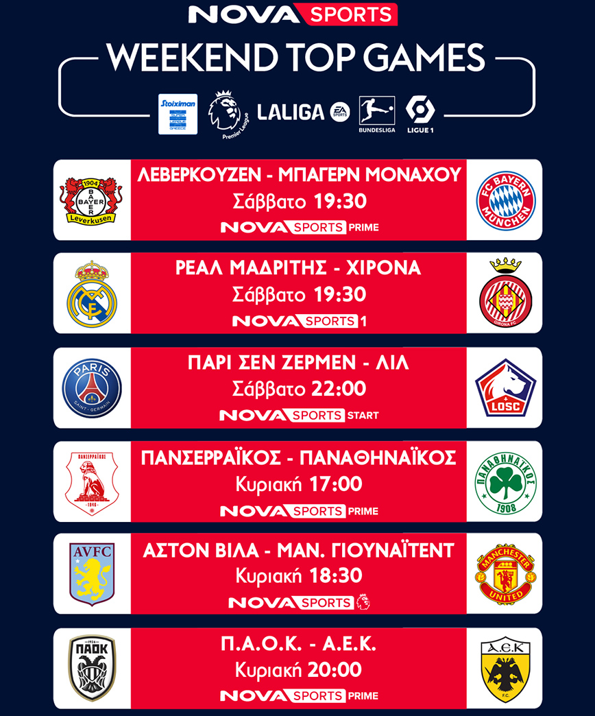 Ποδοσφαιρική πανδαισία με περισσότερους από 50 LIVE αγώνες έρχεται και αυτή την εβδομάδα αποκλειστικά στο γήπεδο του Novasports! Με το ντέρμπι ΠΑΟΚ – ΑΕΚ και τους αγώνες Πανσερραϊκός – Παναθηναϊκός και ΠΑΣ Γιάννινα – Άρης για το ελληνικό πρωτάθλημα, με τα ντέρμπι σε Bundesliga με Λεβερκούζεν – Μπάγερν Μονάχου, σε LaLiga EA Sports με Ρεάλ Μαδρίτης – Χιρόνα, σε Ligue 1 με Παρί Σεν Ζερμέν – Λιλ και Νις – Μονακό κα φυσικά η καθηλωτική Premier League με Λίβερπουλ – Μπέρνλι, Γουέστ Χαμ – Άρσεναλ και Μάντσεστερ Σίτι – Έβερτον! Και φυσικά με την LIVE κλήρωση του UEFA Nations League 2024-2025!
