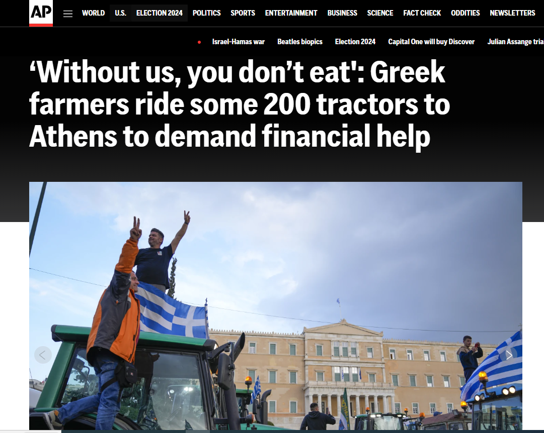 «Χωρίς εμάς δεν τρως»: Έλληνες αγρότες οδηγούν περίπου 200 τρακτέρ στην Αθήνα για να ζητήσουν οικονομική βοήθεια, είναι ο τίτλος του Associated Press.