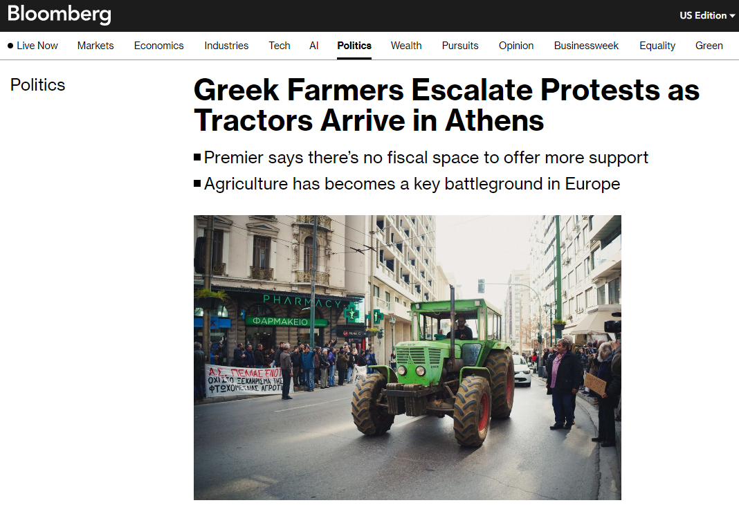 Οι Έλληνες αγρότες κλιμακώνουν τις διαδηλώσεις καθώς τα τρακτέρ φτάνουν στην Αθήνα, είναι ο τίτλος του Bloomberg.