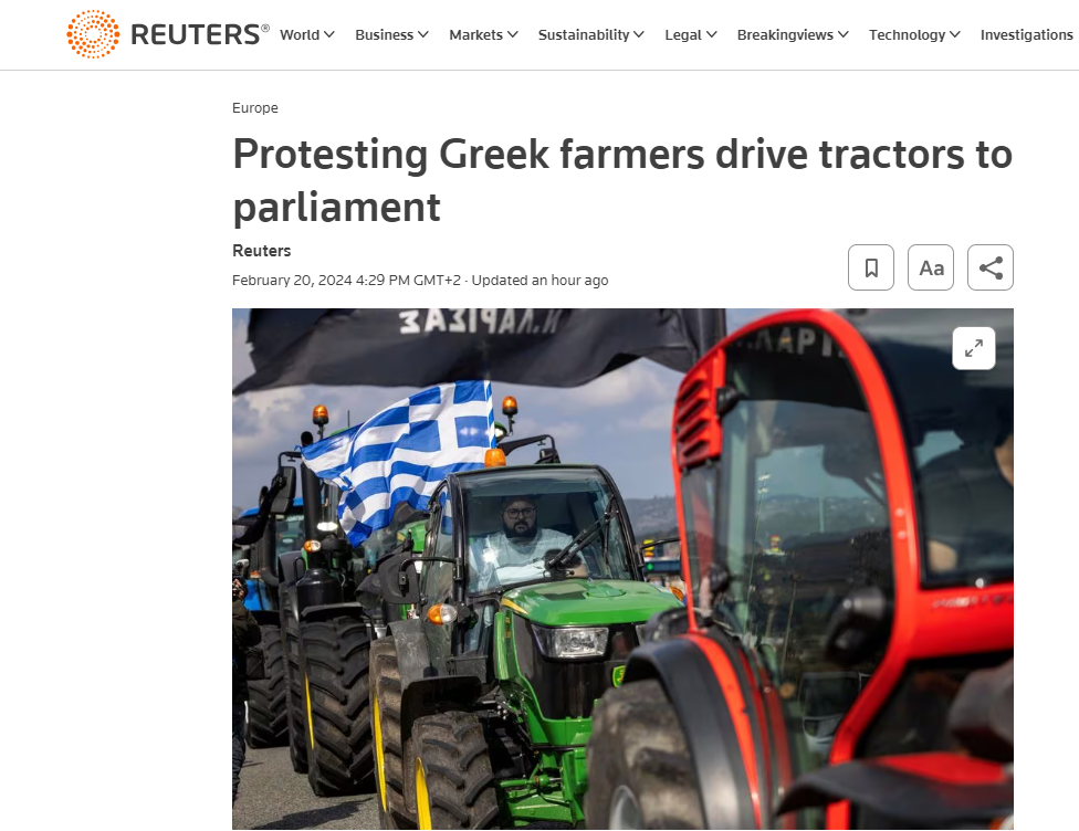 «Έλληνες αγρότες κατέβασαν τα τρακτέρ τους στην Αθήνα, κλιμακώνοντας τις κινητοποιήσεις εβδομάδων και ζητώντας την αύξηση του κόστους, τον ξένο ανταγωνισμό και τις καταστροφικές πλημμύρες, γράφει το πρακτορείο Reuters.