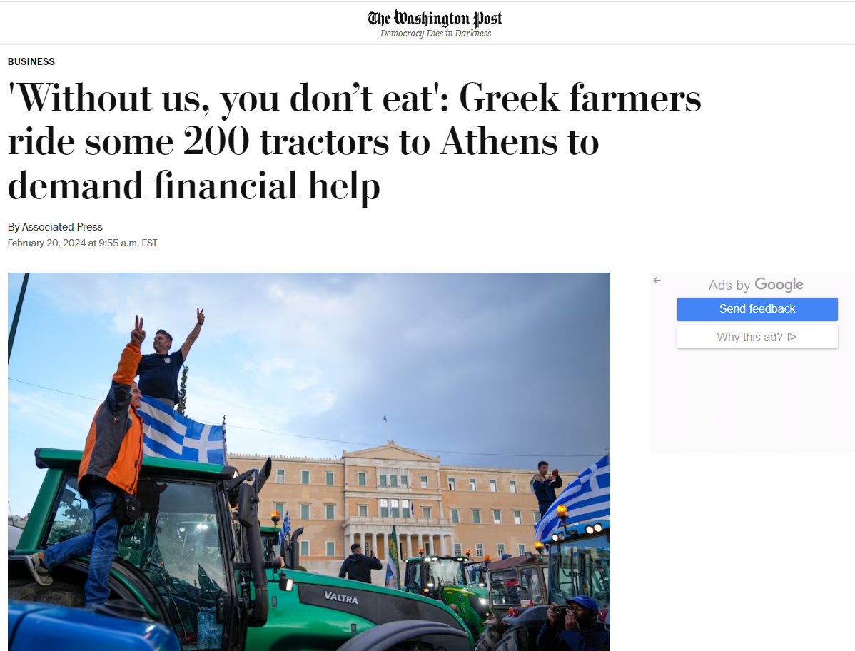 «Χωρίς εμάς δεν τρως»: Έλληνες αγρότες οδηγούν περίπου 200 τρακτέρ στην Αθήνα για να ζητήσουν οικονομική βοήθεια, γράφει και η Washington Post.