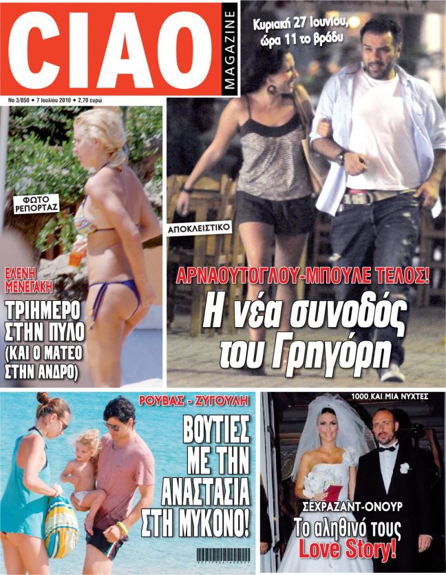 Αύριο κυκλοφορεί το τρίτο τεύχος με νέα αποκλειστικά θέματα όπως τη νέα συνοδό του Γρηγόρη Αρναούτογλου, τις οικογενειακές διακοπές του ζεύγους Ρουβά-Ζυγούλη στην Μύκονο. Τις διακοπές της Ελένης Μενεγάκη στην Πύλο.