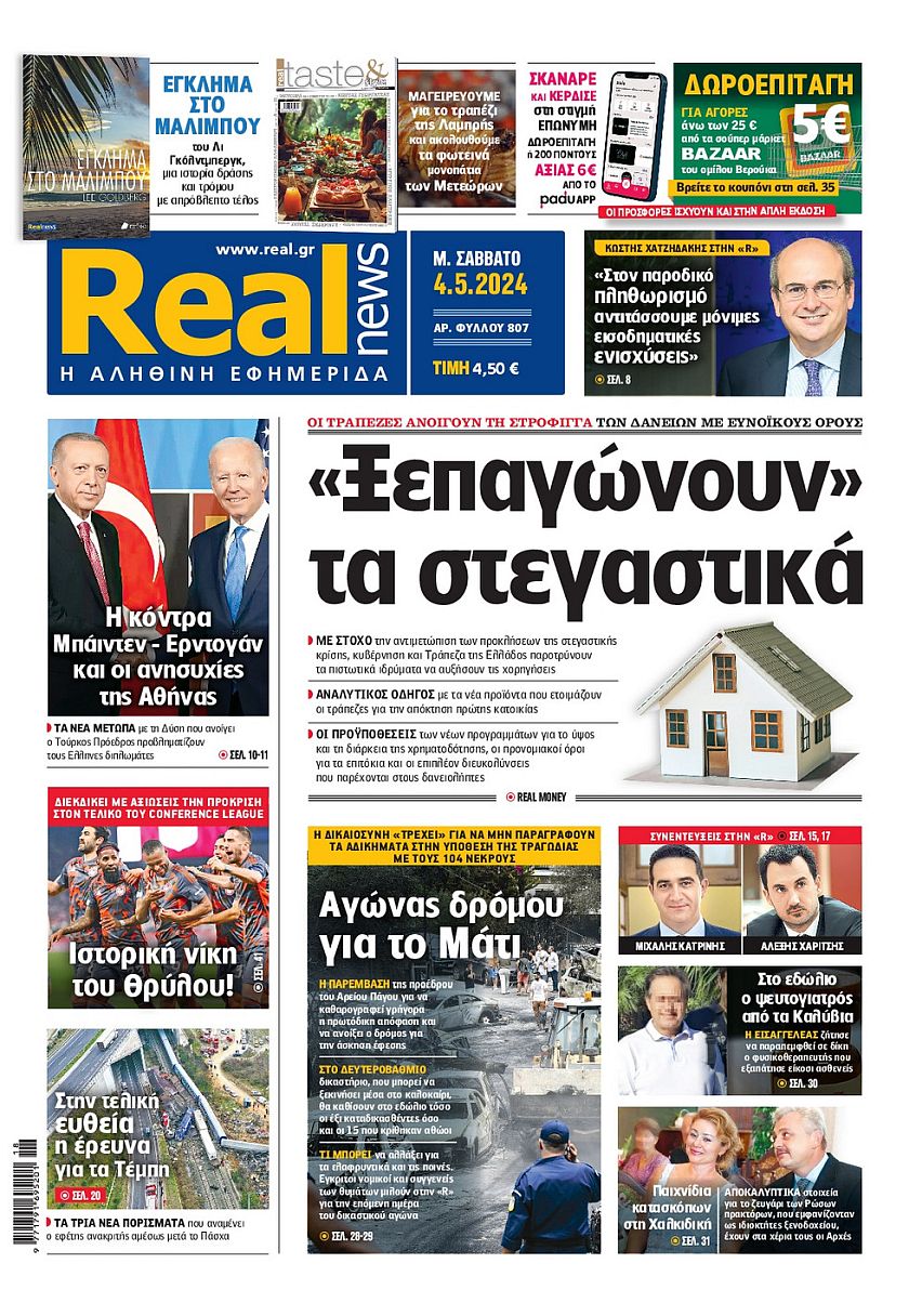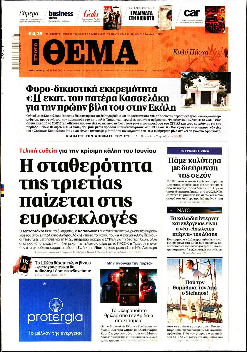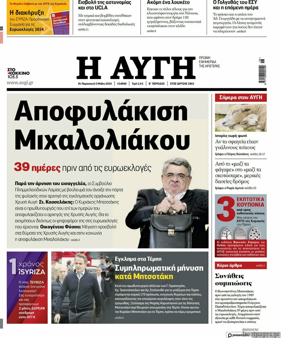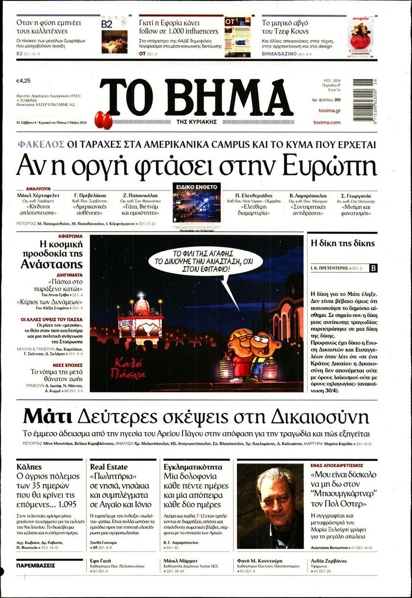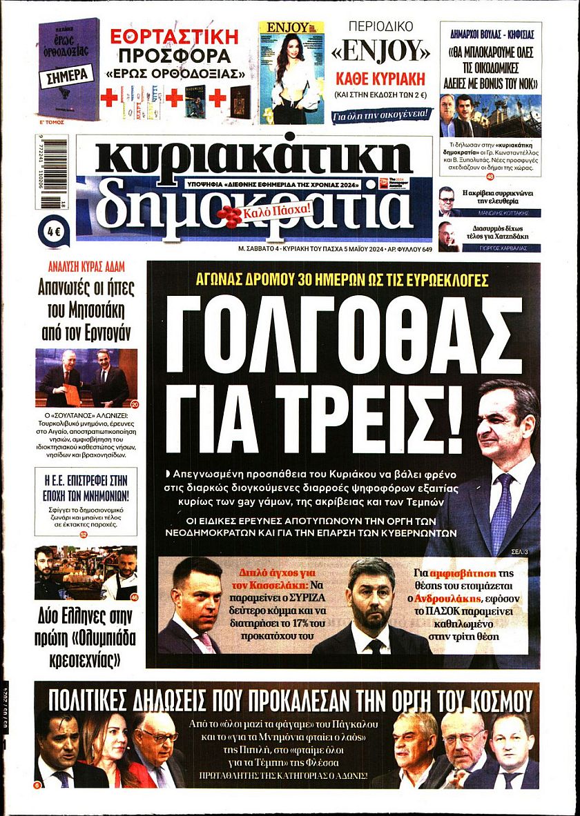 Ο ένας μήνας που έχει απομείνει μέχρι τις ευρωεκλογές, οι τιμές των ακινήτων σε όλη την Ελλάδα και οι ταραχές που έχουν ξεσπάσει στα αμερικανικά πανεπιστήμια εξαιτάς του πολέμου του Ισραήλ με τη Χαμάς ξεχωρίζουν μεταξύ άλλων στα πρωτοσέλιδα των κυριακάτικων εφημερίδων.