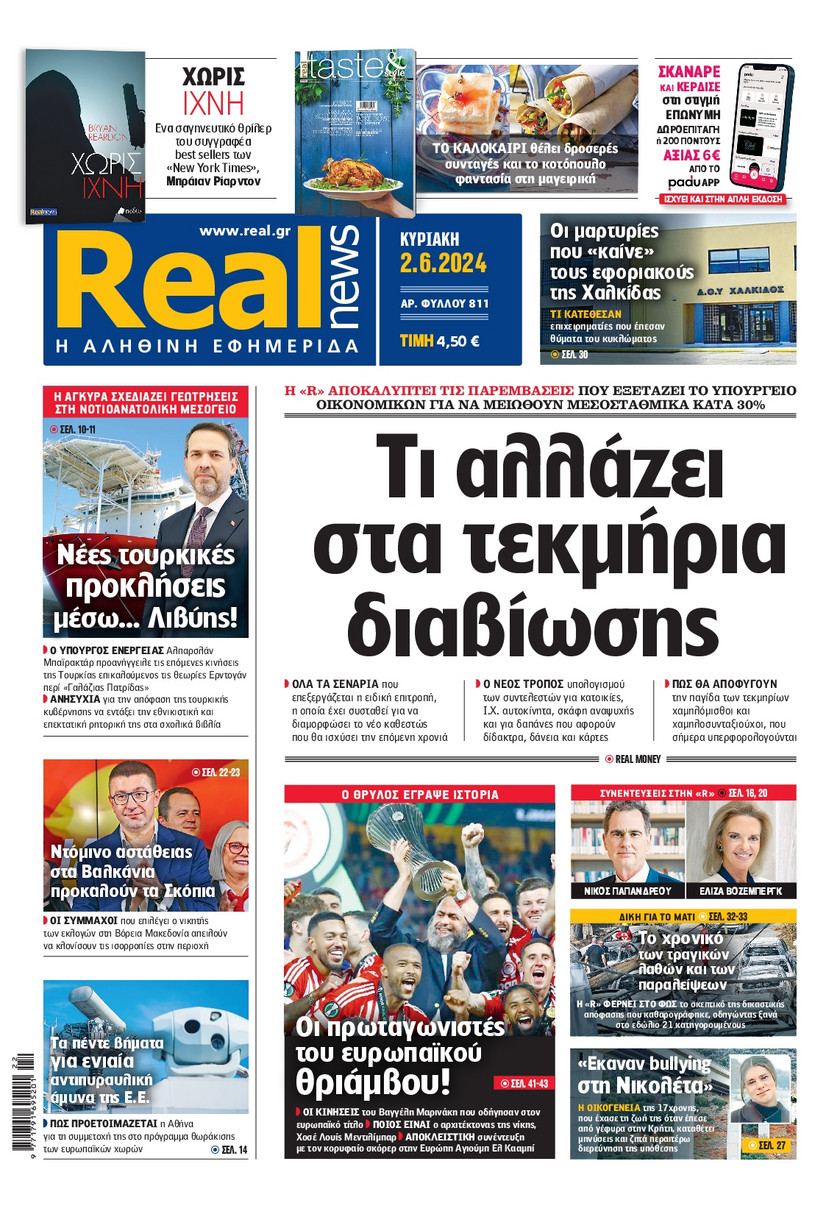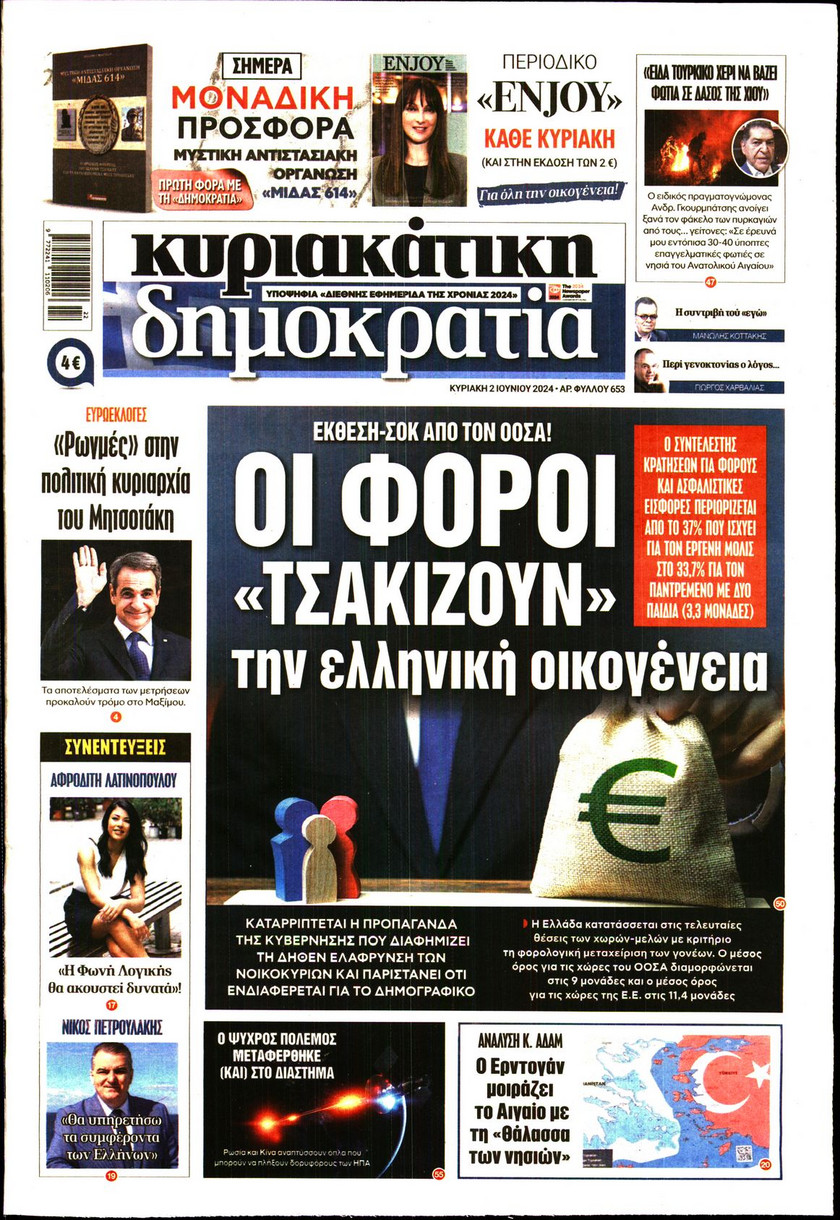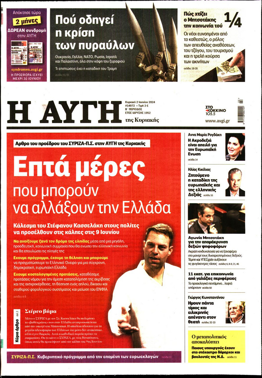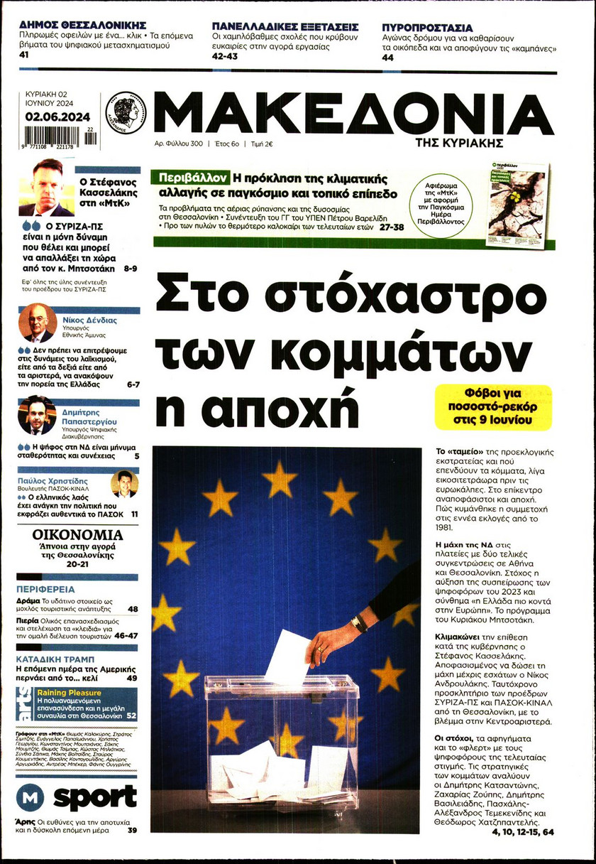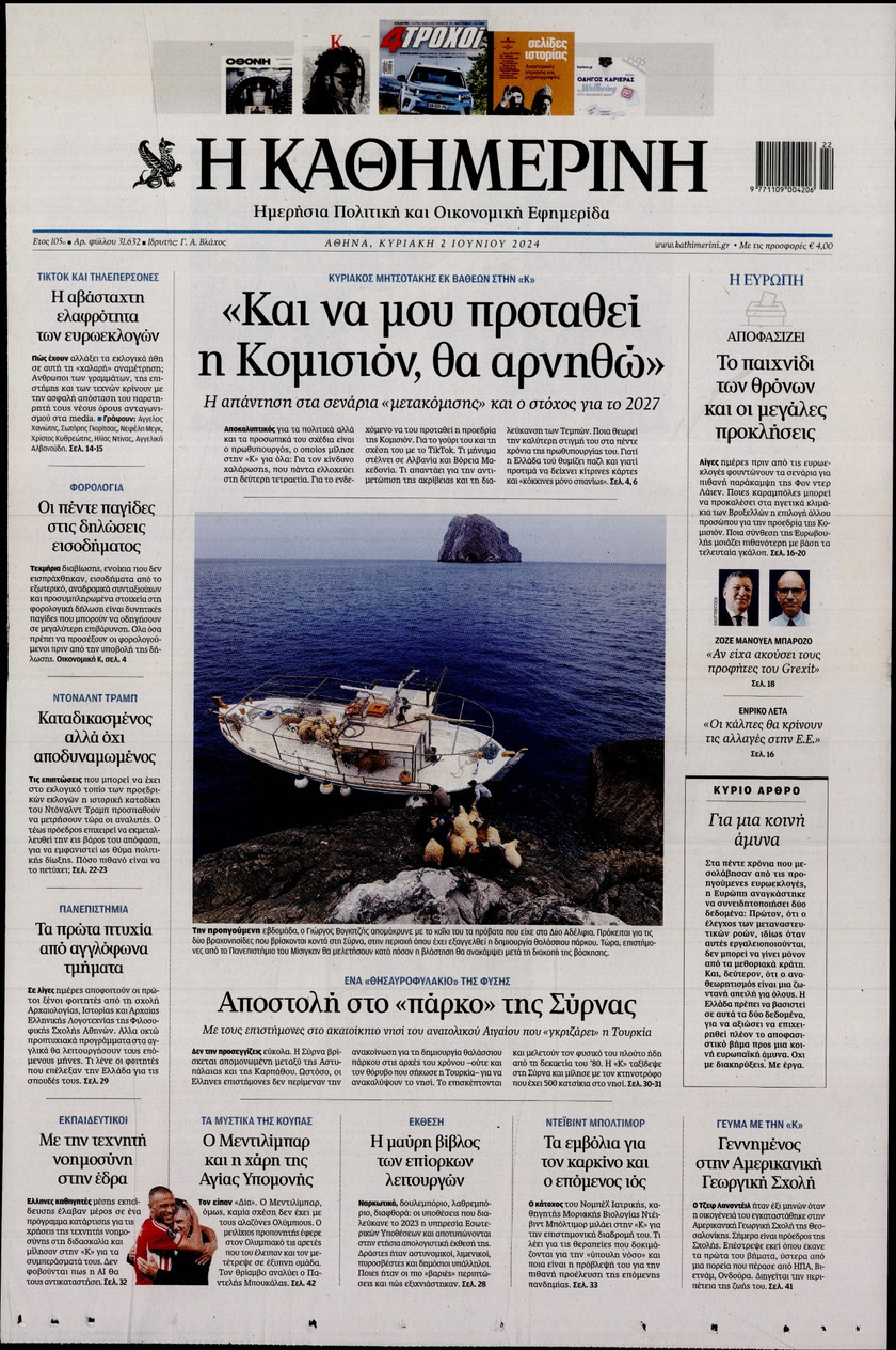 Οι επτά μέρες που έχουν απομείνει μέχρι τις ευρωεκλογές, οι αλλαγές στα τεκμήρια διαβίωσης και ο σχεδιασμός της κυβέρνησης για τα θαλάσσια πάρκα και ξεχωρίζουν μεταξύ άλλων στα πρωτοσέλιδα των κυριακάτικων εφημερίδων.