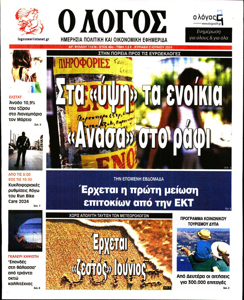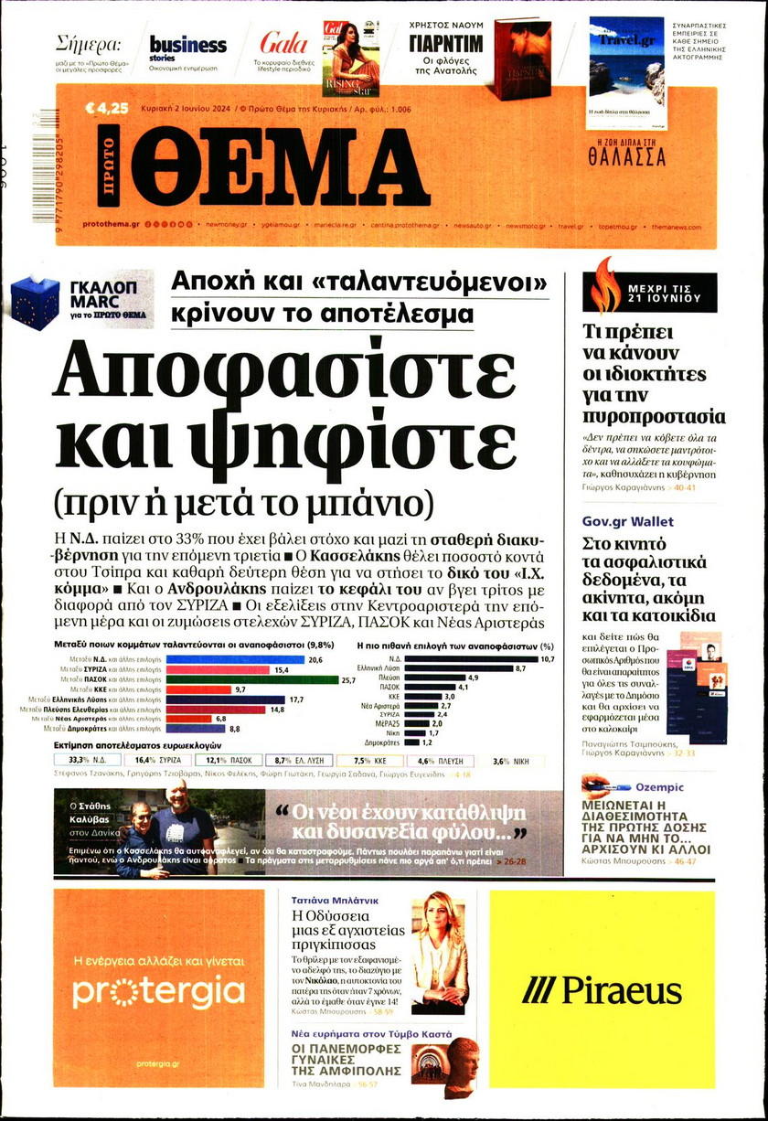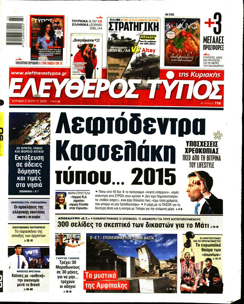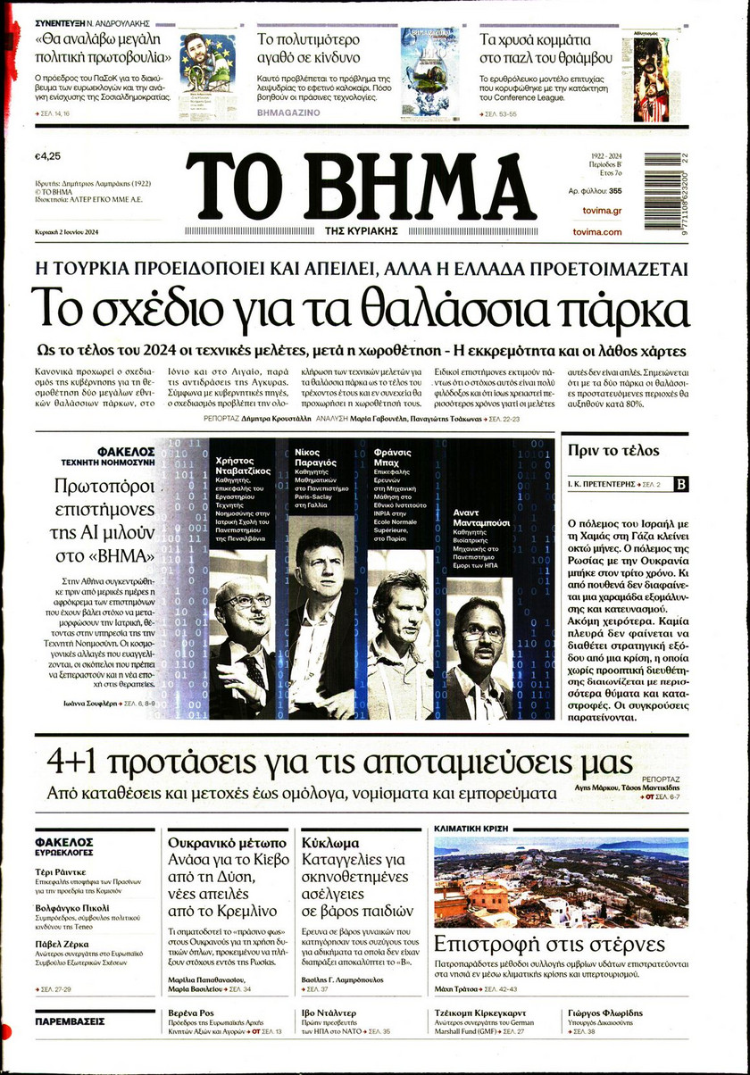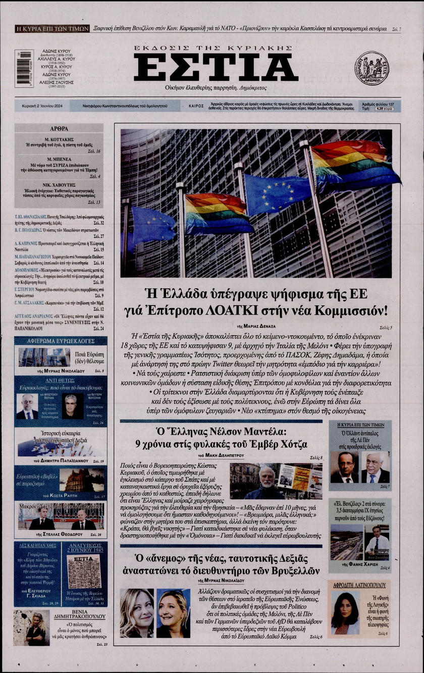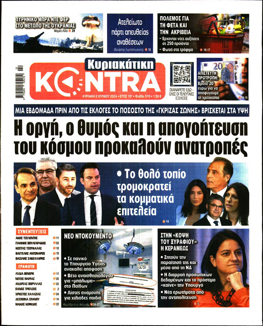 Οι επτά μέρες που έχουν απομείνει μέχρι τις ευρωεκλογές, οι αλλαγές στα τεκμήρια διαβίωσης και ο σχεδιασμός της κυβέρνησης για τα θαλάσσια πάρκα και ξεχωρίζουν μεταξύ άλλων στα πρωτοσέλιδα των κυριακάτικων εφημερίδων.