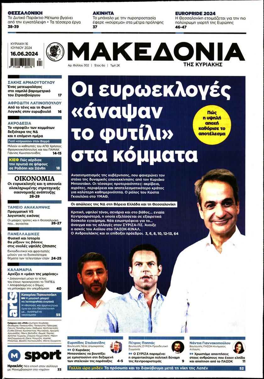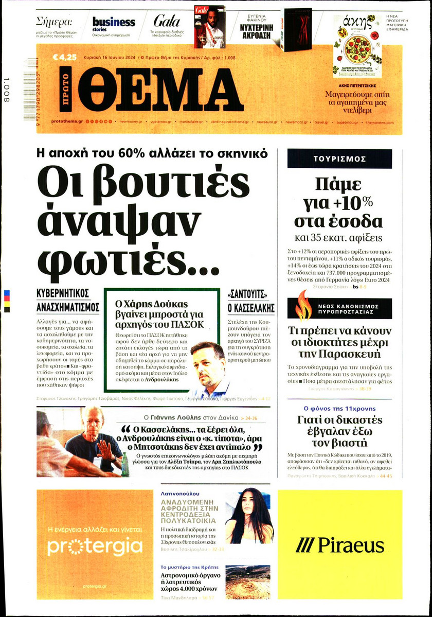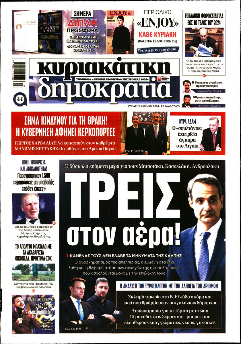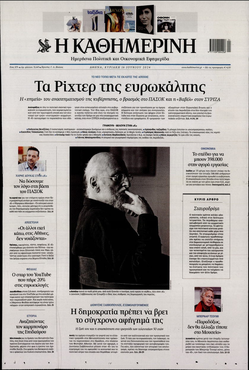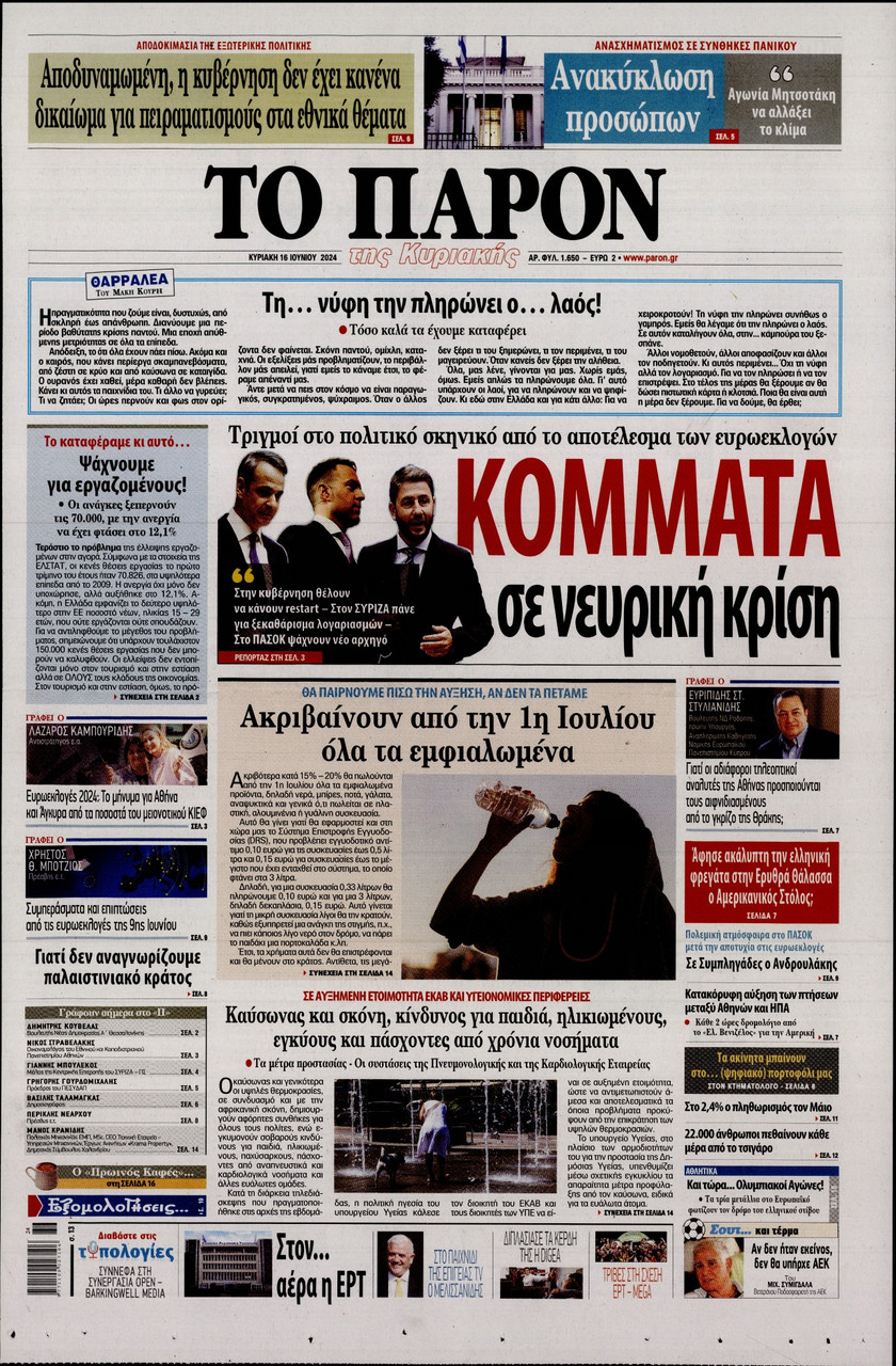 Η αλλαγή του πολιτικού σκηνικού στην Ελλάδα από το αποτέλεσμα των ευρωεκλογών, οι εξελίξεις στην Κεντροαριστερά, τα αναμενόμενα έσοδα από τον τουρισμό και οι αλλαγές στο σύστημα φορολόγησης που εξετάζει η κυβέρνηση ξεχωρίζουν στα πρωτοσέλιδα των κυριακάτικων εφημερίδων.