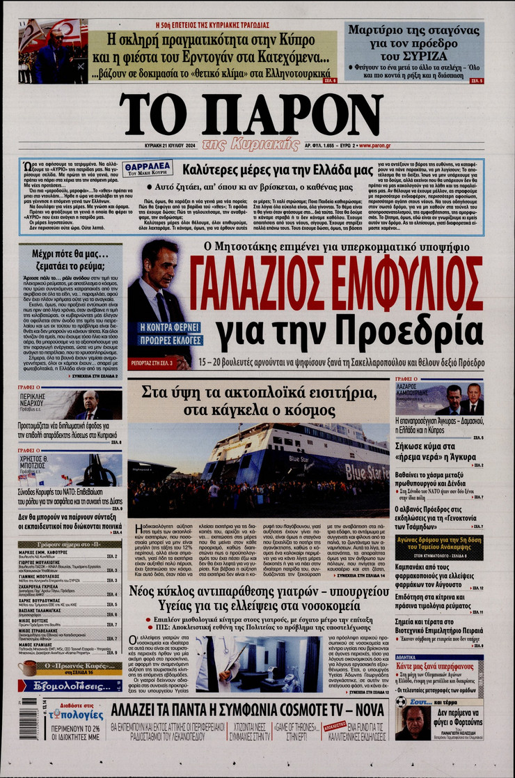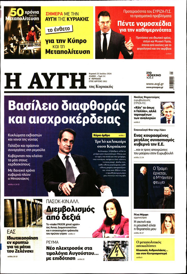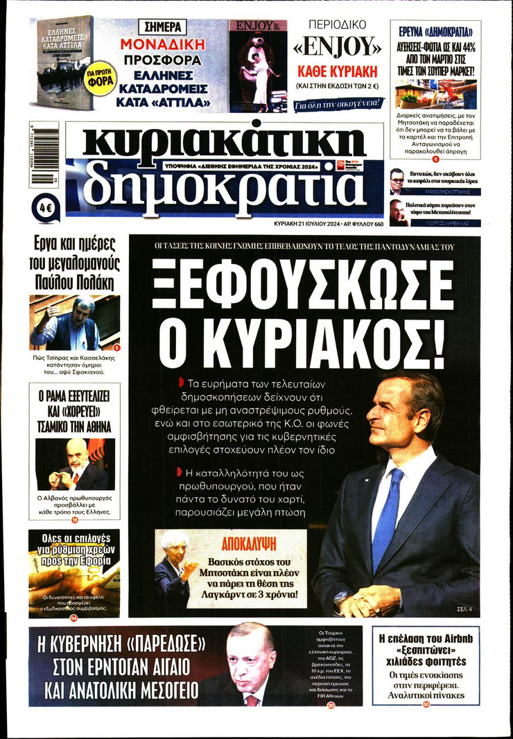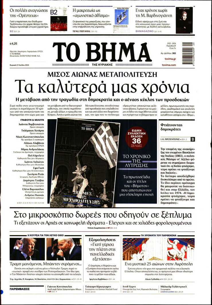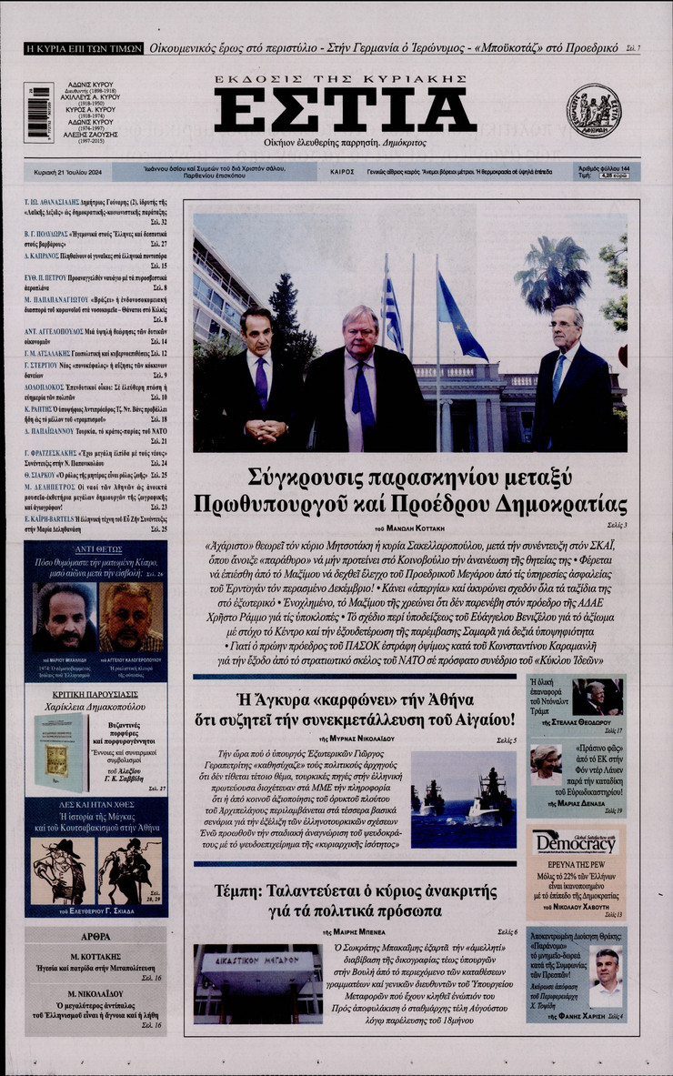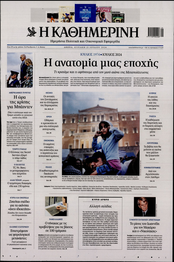 Τα 50 χρόνια που συμπληρώθηκαν από την αποκατάσταση της Δημοκρατίας στην Ελλάδα, οι δραματικές προειδοποιήσεις των επιστημόνων για τον κίνδυνο λειψυδρίας στην Ελλάδα, οι πιθανότητες αντικατάστασης του Τζο Μπάιντεν για την υποφηφιότητα της προεδρίας των ΗΠΑ και η αύξηση των τουριστών στην Ελλάδα ξεχωρίζουν στα πρωτοσέλιδα των κυριακάτικων εφημερίδων.