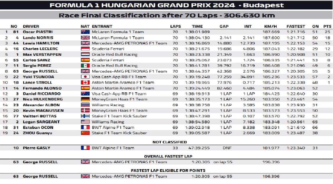 Η τελική κατάταξη του 13ου Grand Prix στην Ουγγαρία έχει ως εξής: