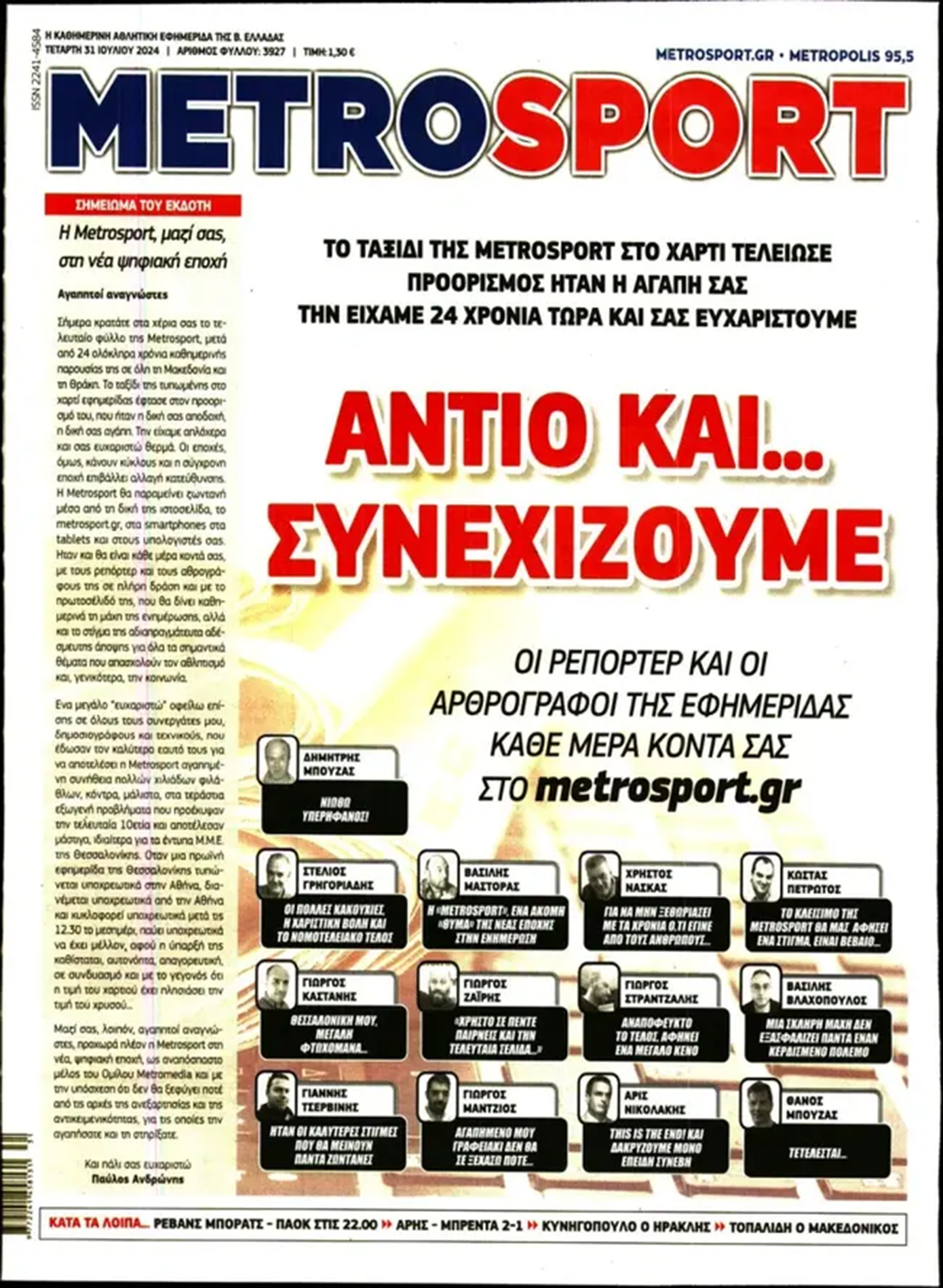 Μετά από 24 χρόνια σταματά σήμερα η έκδοση της αθλητικής εφημερίδας Metrosport, αφού σήμερα τυπώθηκε το τελευταίο φύλλο της εφημερίδας, με έδρα τη Θεσσαλονίκη.