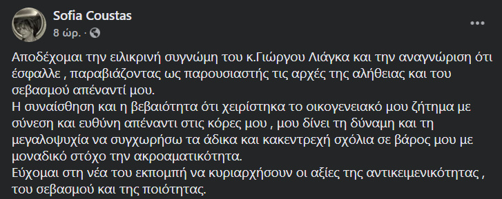 Μήνυση κατά του Γιώργου Λιάγκα, που τελικώς απέσυρε μετά τη δημόσια «συγγνώμη» του παρουσιαστή, είχε καταθέσει και η Σοφία Γιαννικοπούλου πρώην σύζυγος του εφοπλιστή Γιάννη Κούστα. Η κα. Γιαννικοπούλου εγκαλούσε τον παρουσιαστή για ρεπορτάζ που είχε παρουσιάσει και το οποίο ανέφερε πως η ίδια πουλούσε έναντι ενός εκατομμυρίου ευρώ «διαμέρισμα με ερωτικά αξεσουάρ».