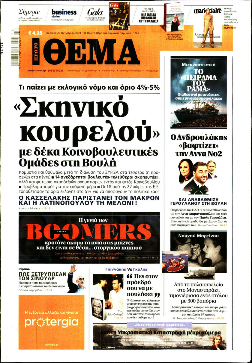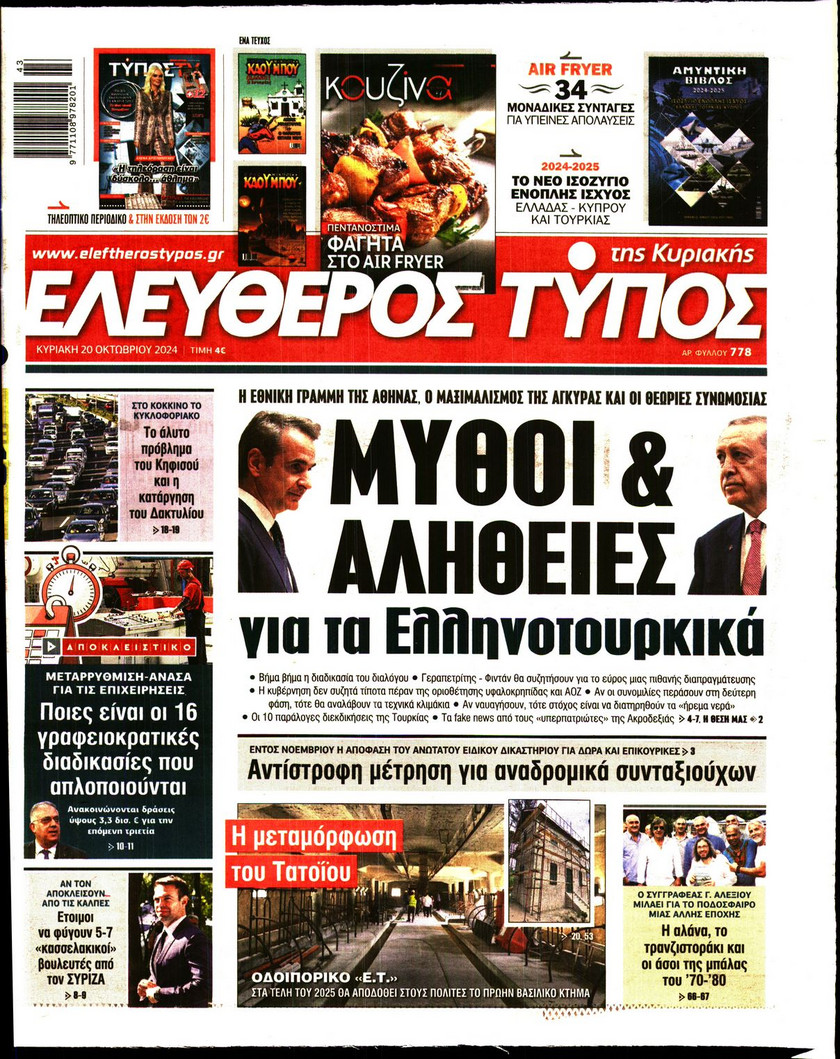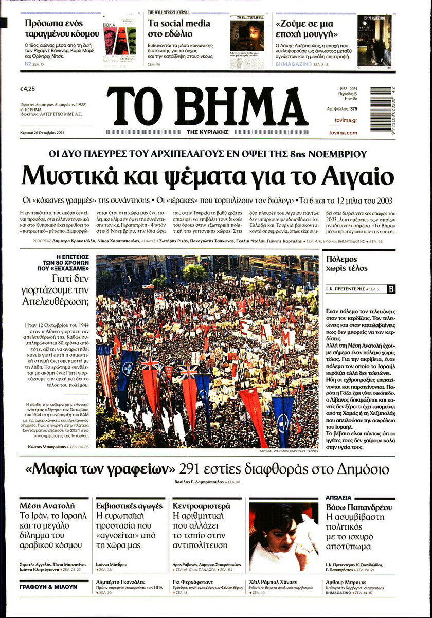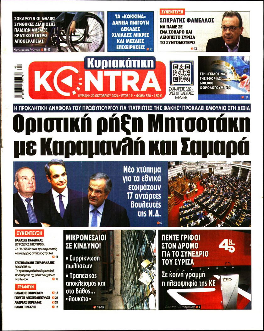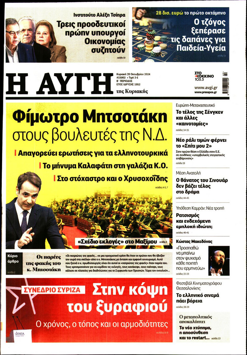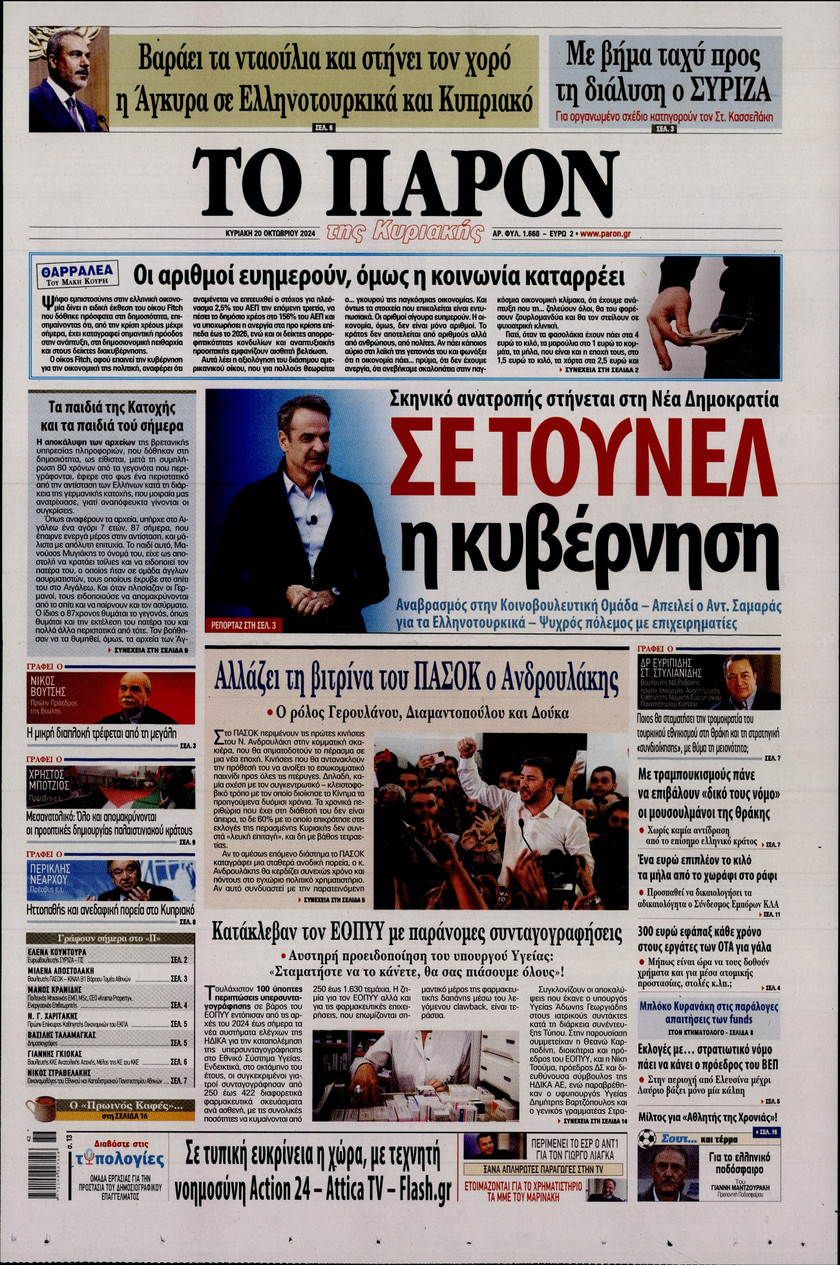 Η συνάντηση των υπουργών Εξωτερικών Ελλάδας – Τουρκίας στις αρχές Νοεμβρίου με την ξαφνική ανάσυρση μαξιμαλιστικής ατζέντας που επαναφέρει η τουρκική κυβέρνηση, οι παράνομες συνταγογραφήσεις που λυμαίνονται τα χρήματα των ασφαλιστικών φορέων, η ανθρωπογεωγραφία της Βουλής με τις 10! κοινοβουλευτικές ομάδες και ο πόλεμος που μοιάζει να μην έχει τέλος στη Μέση Ανατολή ξεχωρίζουν στα πρωτοσέλιδα των κυριακάτικων εφημερίδων.