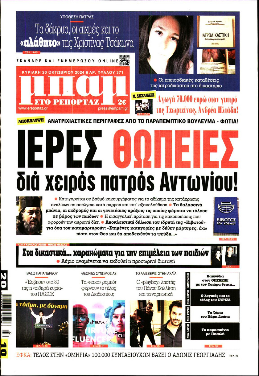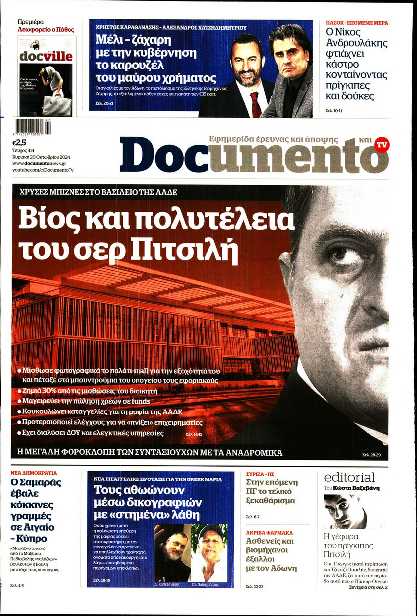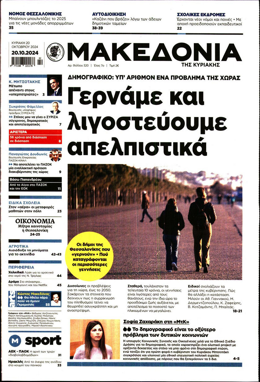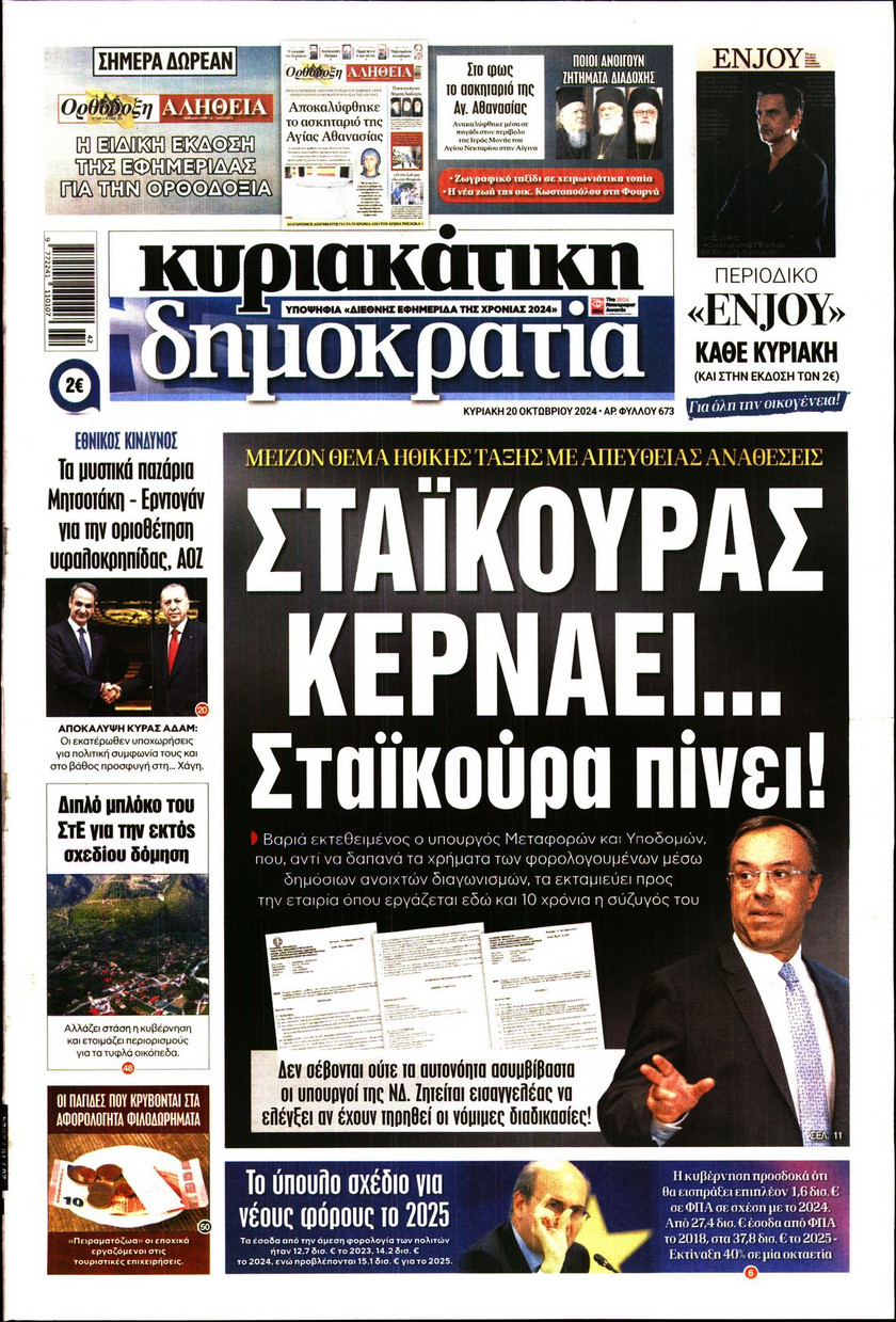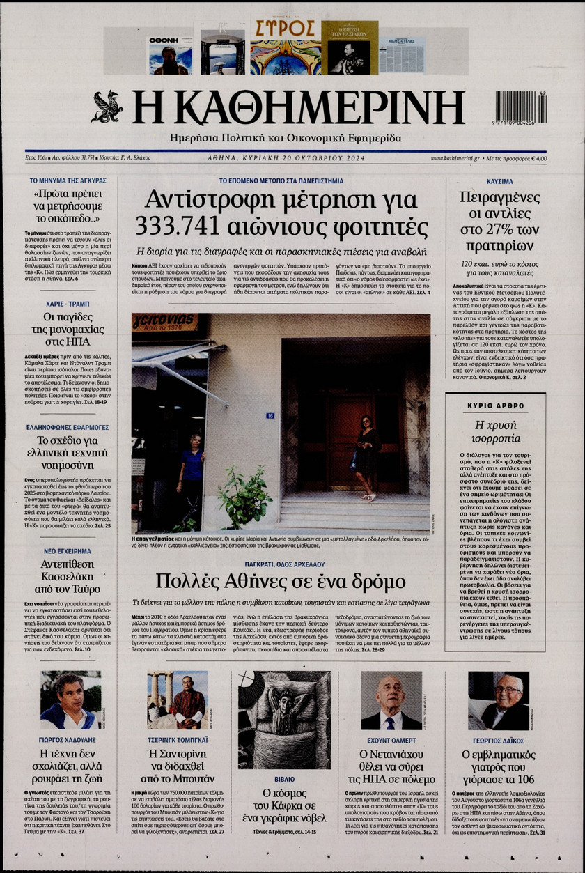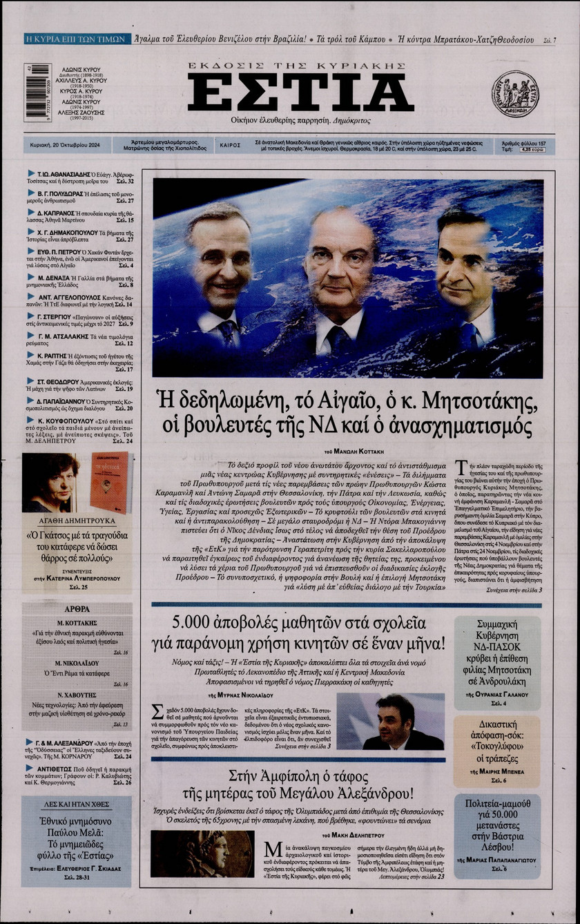 Η συνάντηση των υπουργών Εξωτερικών Ελλάδας – Τουρκίας στις αρχές Νοεμβρίου με την ξαφνική ανάσυρση μαξιμαλιστικής ατζέντας που επαναφέρει η τουρκική κυβέρνηση, οι παράνομες συνταγογραφήσεις που λυμαίνονται τα χρήματα των ασφαλιστικών φορέων, η ανθρωπογεωγραφία της Βουλής με τις 10! κοινοβουλευτικές ομάδες και ο πόλεμος που μοιάζει να μην έχει τέλος στη Μέση Ανατολή ξεχωρίζουν στα πρωτοσέλιδα των κυριακάτικων εφημερίδων.