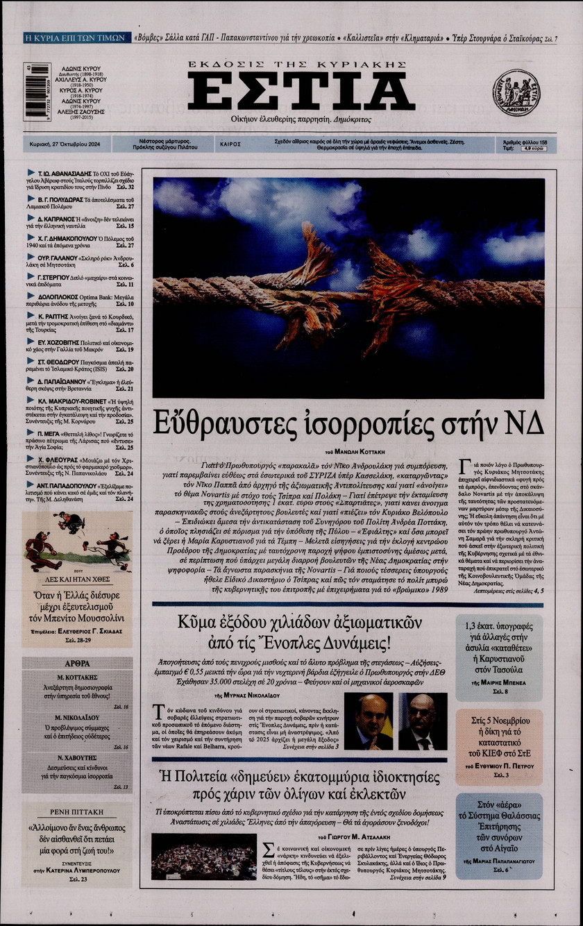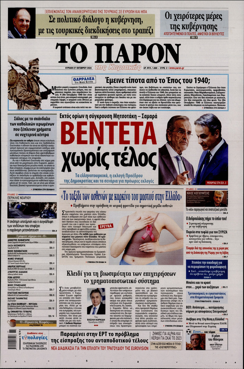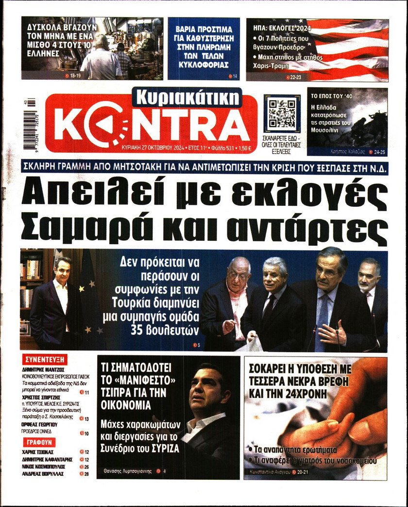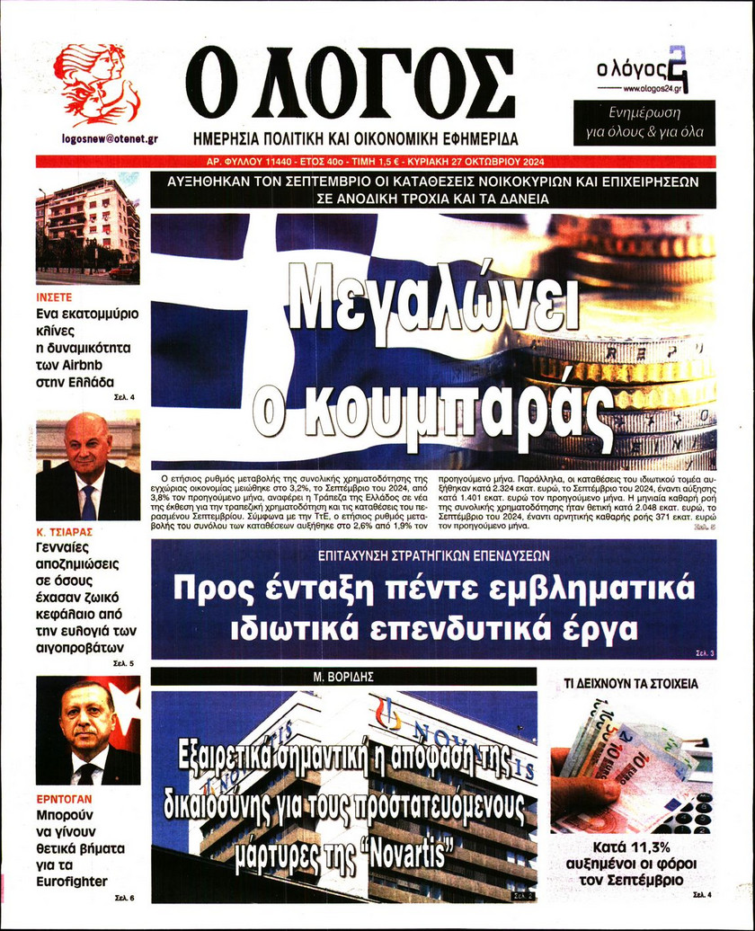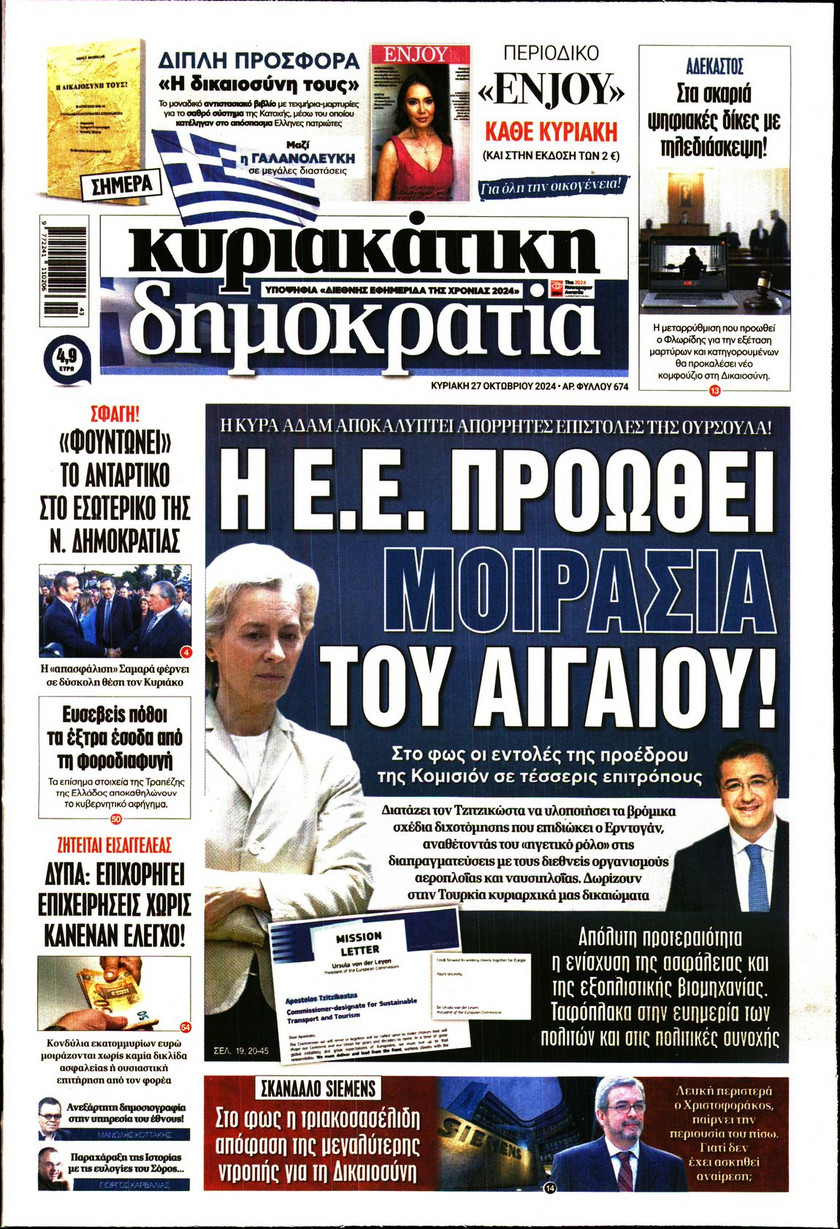 Οι νέες προκλήσεις του Ρετζέπ Ταγίπ Ερντογάν λίγες μόλις ημέρες πριν την επίσκεψη του υπουργού Εξωτερικών της Τουρκίας Χακάν Φιντάν στην Ελλάδα, η νέα ρύθμιση στις ασφαλιστικές εισφορές στο νομοσχέδιο που θα καταθέσει το υπουργείο Εργασίας και τα τελευταία νέα από τα στρατόπεδα της Κάμαλα Χάρις και του Ντόναλντ Τραμπ 10 μόλις ημέρες πριν από τις προεδρικές εκλογές στην Αμερική ξεχωρίζουν στα πρωτοσέλιδα των κυριακάτικων εφημερίδων.