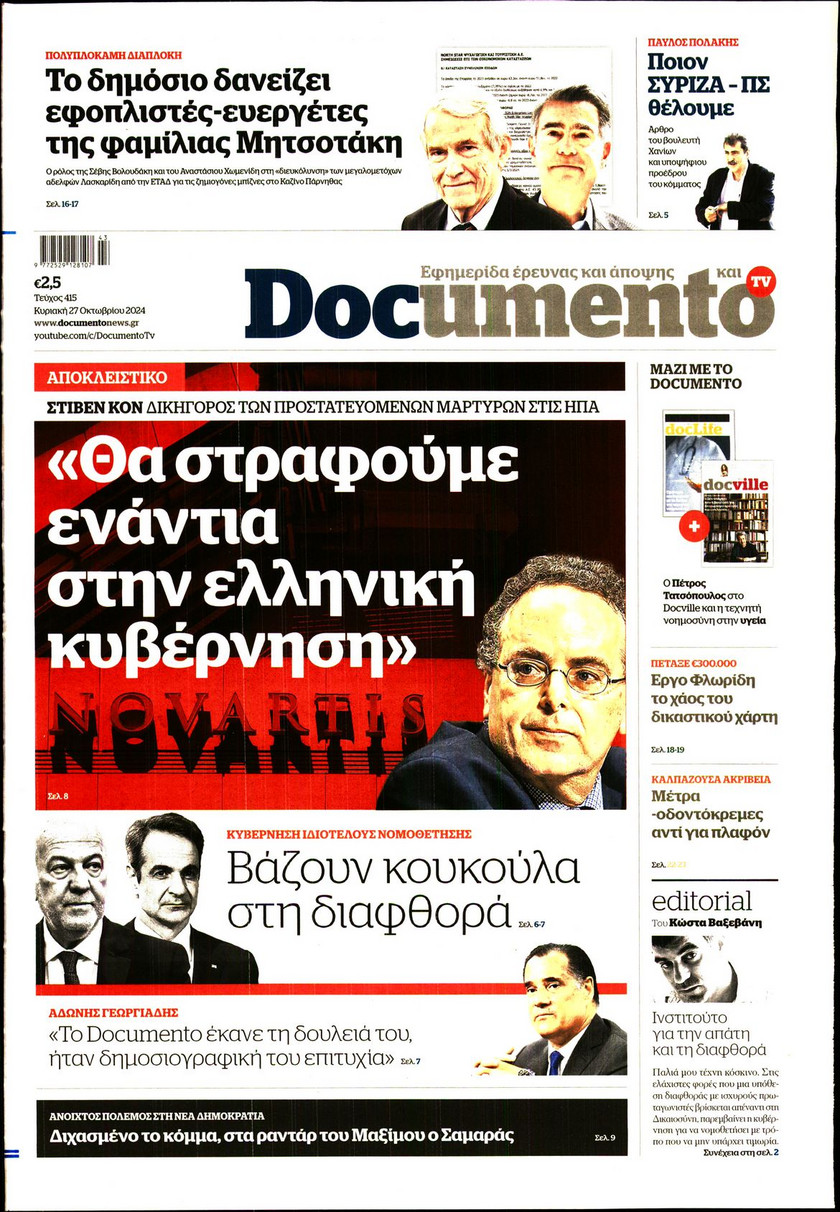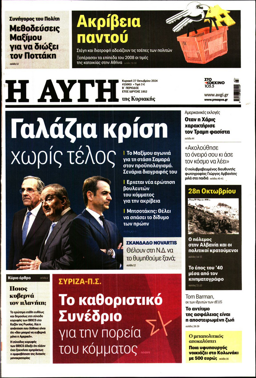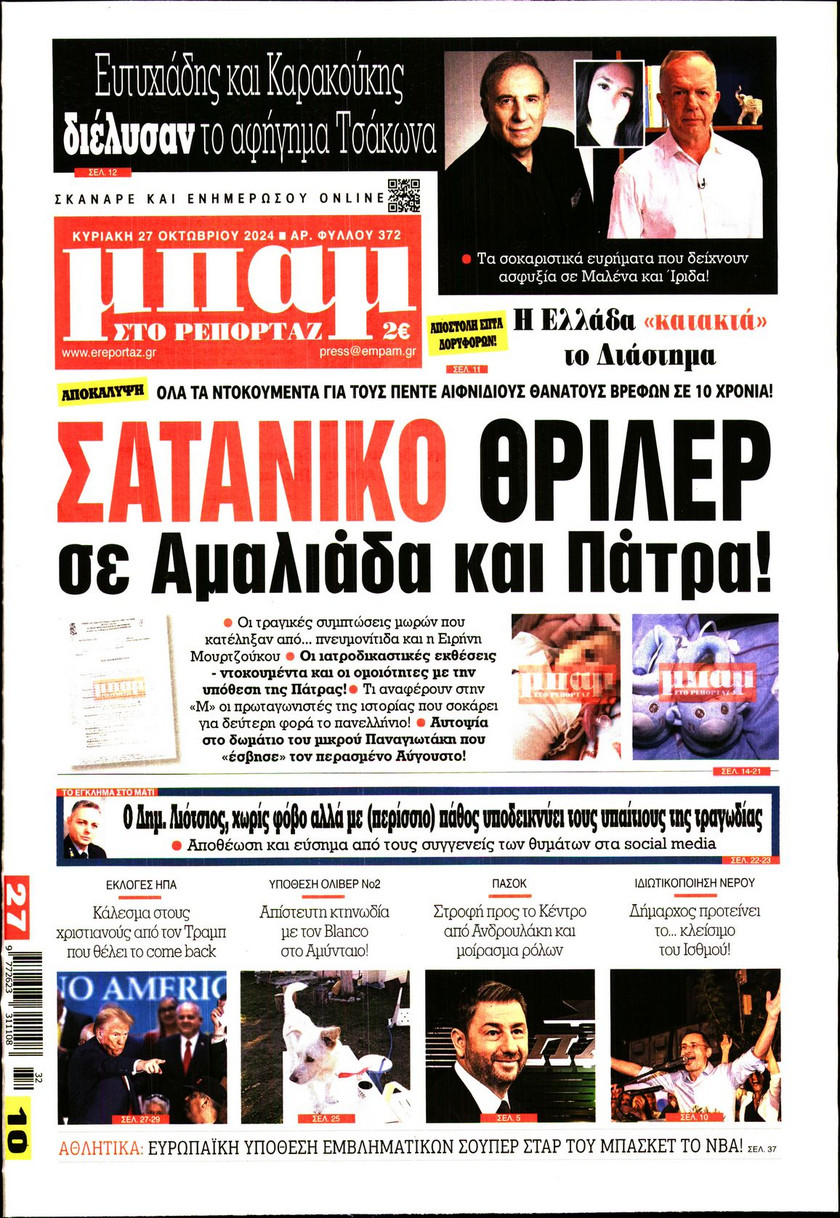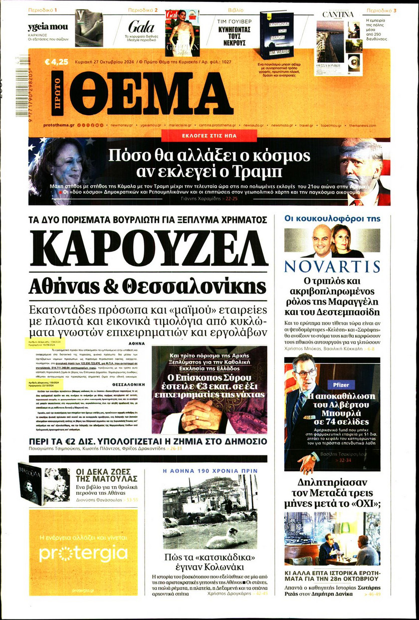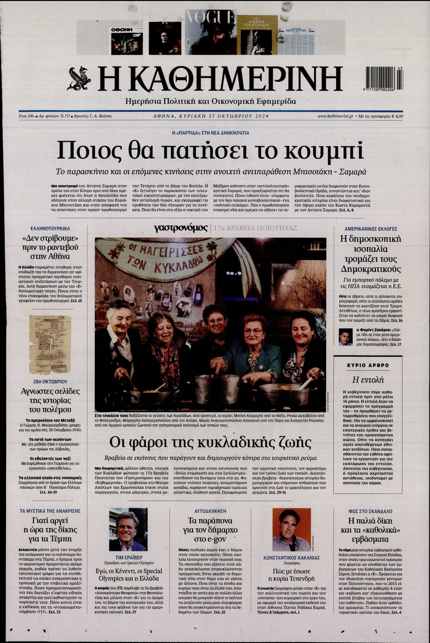 Οι νέες προκλήσεις του Ρετζέπ Ταγίπ Ερντογάν λίγες μόλις ημέρες πριν την επίσκεψη του υπουργού Εξωτερικών της Τουρκίας Χακάν Φιντάν στην Ελλάδα, η νέα ρύθμιση στις ασφαλιστικές εισφορές στο νομοσχέδιο που θα καταθέσει το υπουργείο Εργασίας και τα τελευταία νέα από τα στρατόπεδα της Κάμαλα Χάρις και του Ντόναλντ Τραμπ 10 μόλις ημέρες πριν από τις προεδρικές εκλογές στην Αμερική ξεχωρίζουν στα πρωτοσέλιδα των κυριακάτικων εφημερίδων.